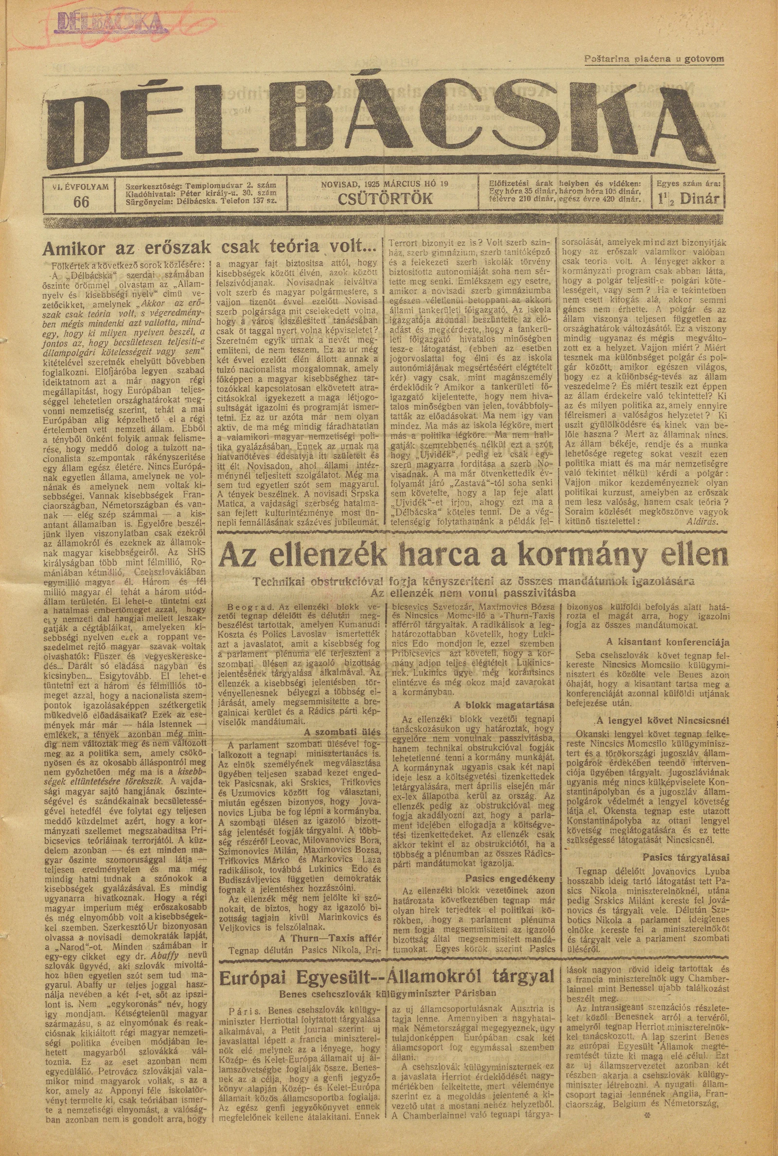 Délbácska, 6. évf. 1925. március 19. 66. sz.