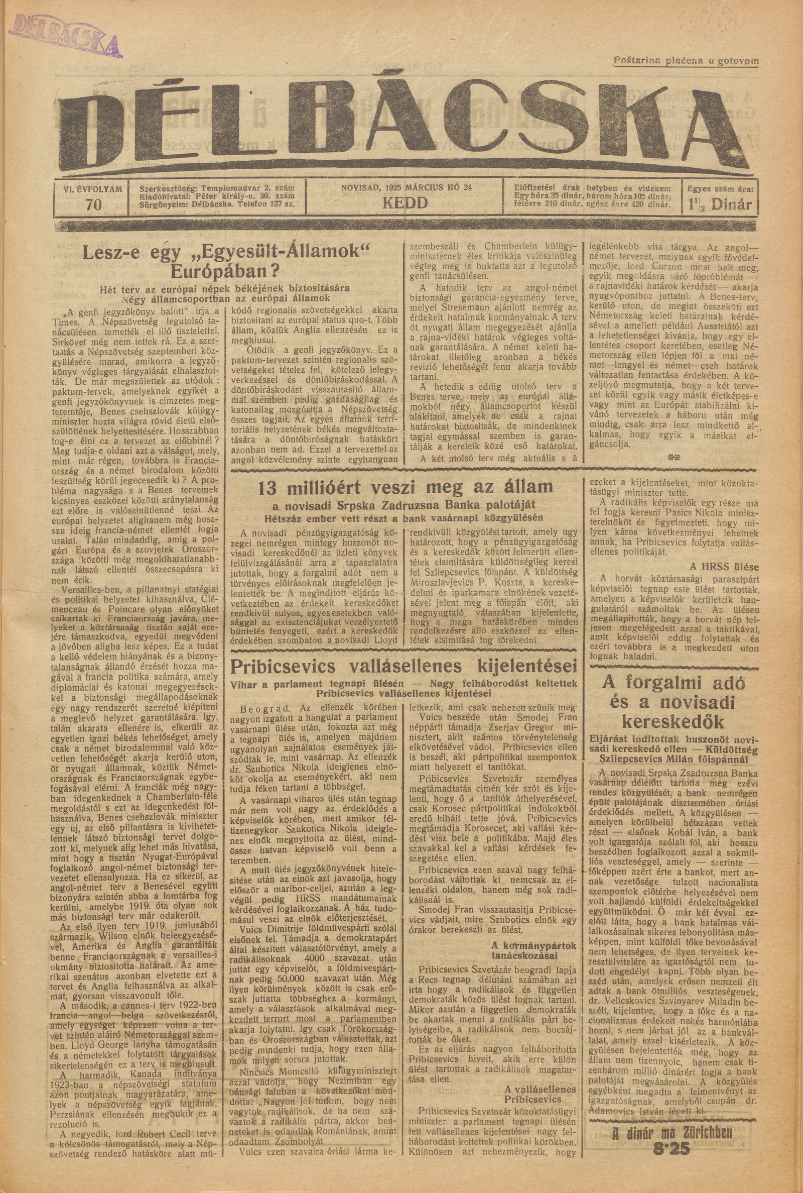 Délbácska, 6. évf. 1925. március 24. 70. sz.