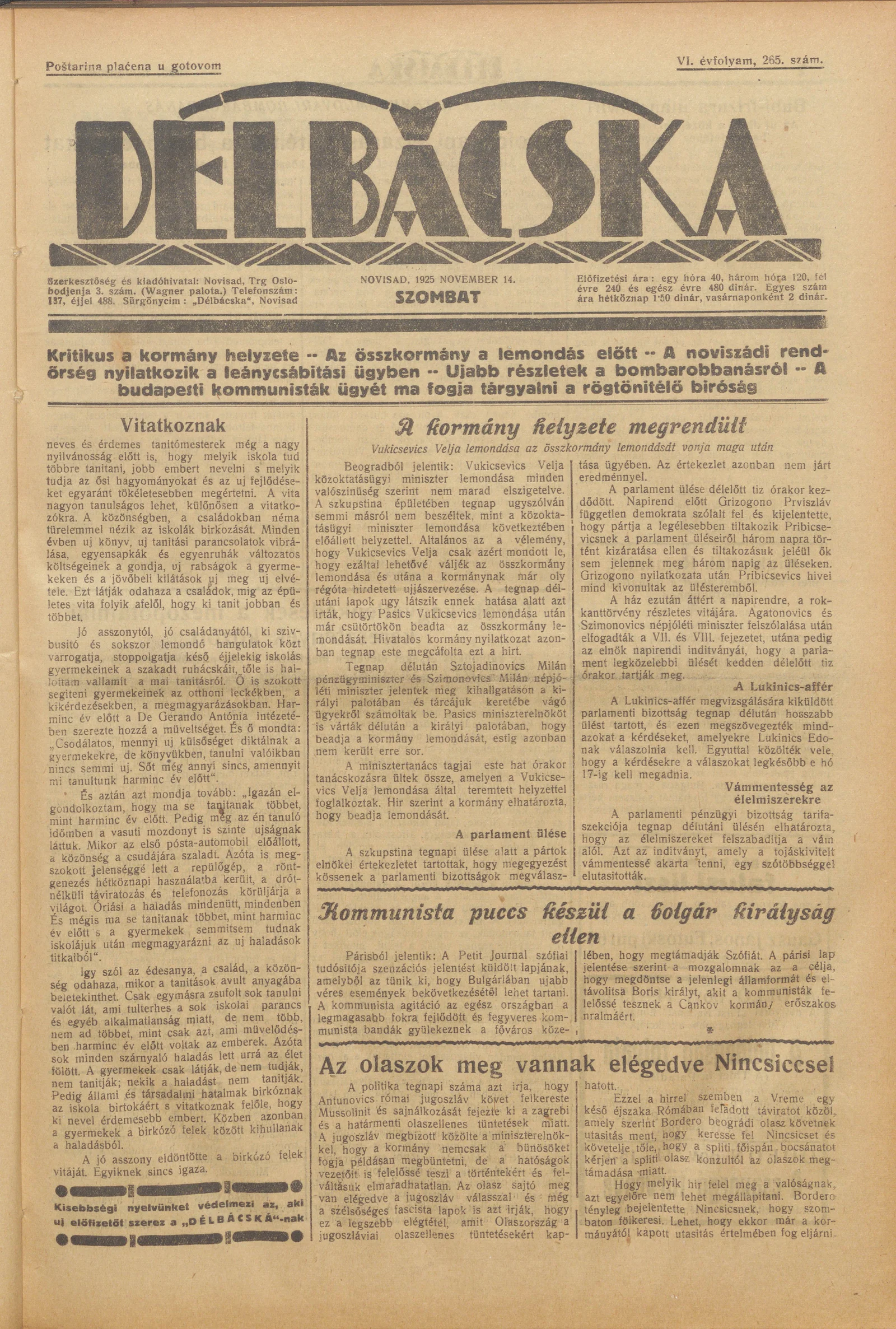 Délbácska, 6. évf. 1925. november 14. 265. sz.
