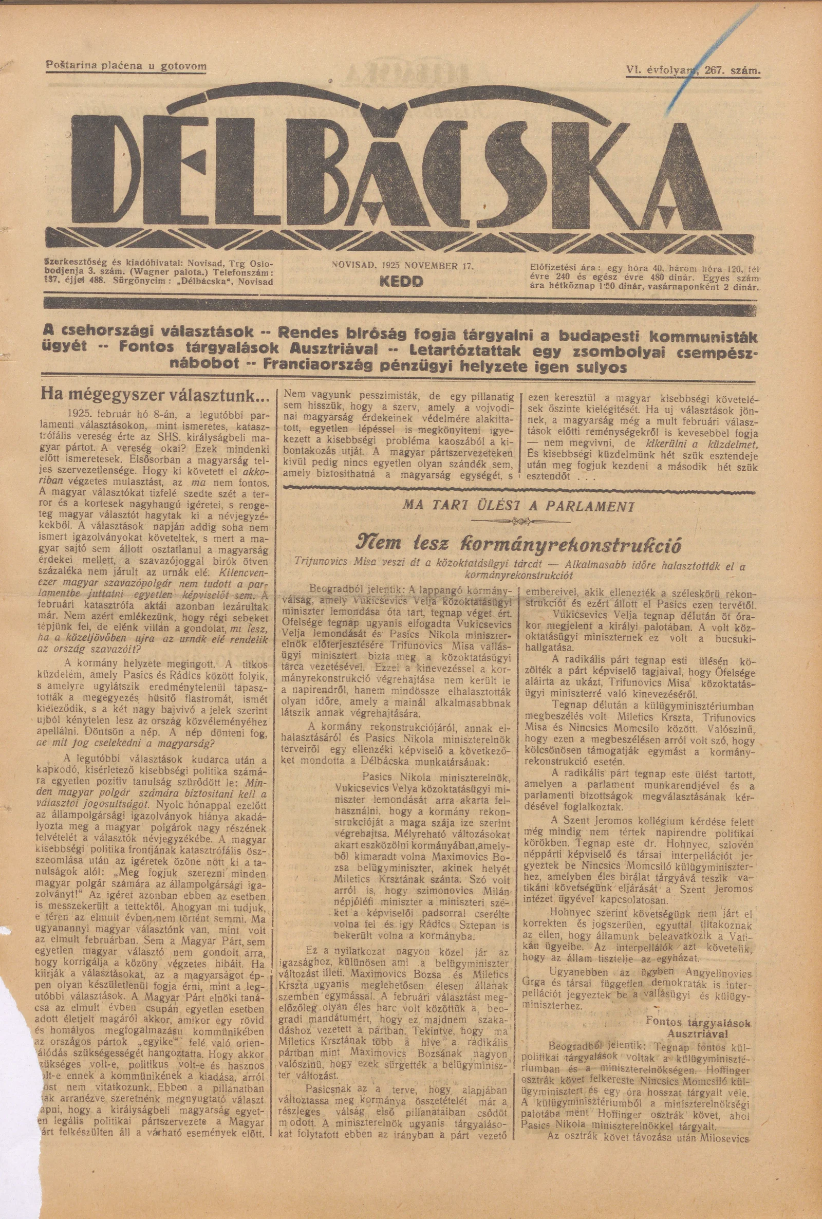 Délbácska, 6. évf. 1925. november 17. 267. sz.