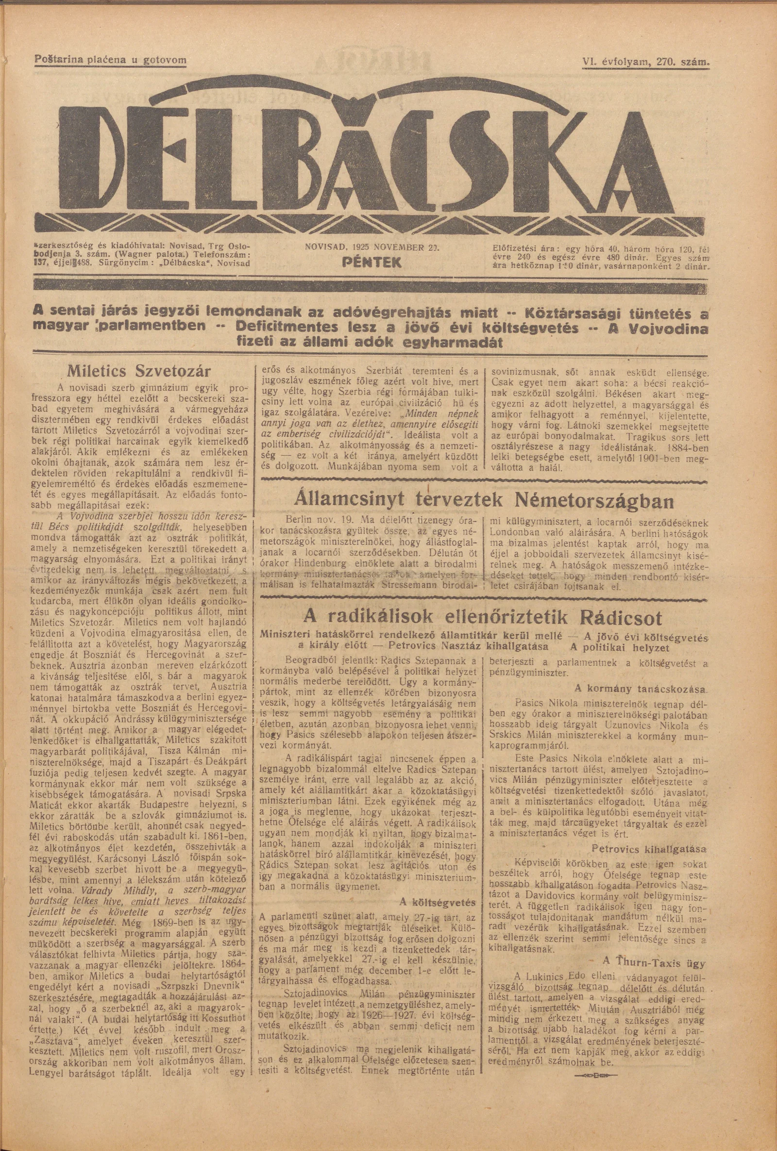 Délbácska, 6. évf. 1925. november 20. 270. sz.