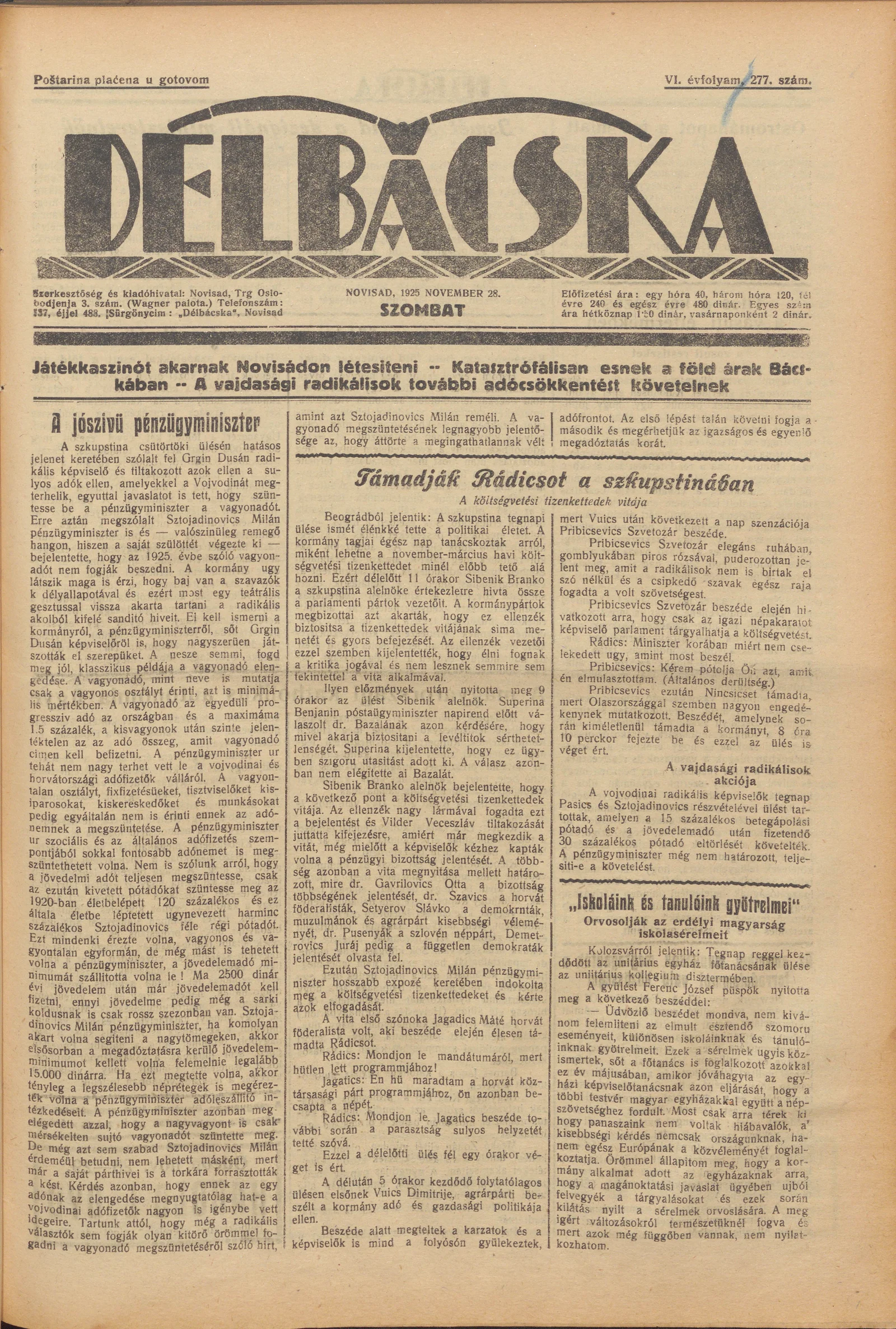 Délbácska, 6. évf. 1925. november 28. 277. sz.