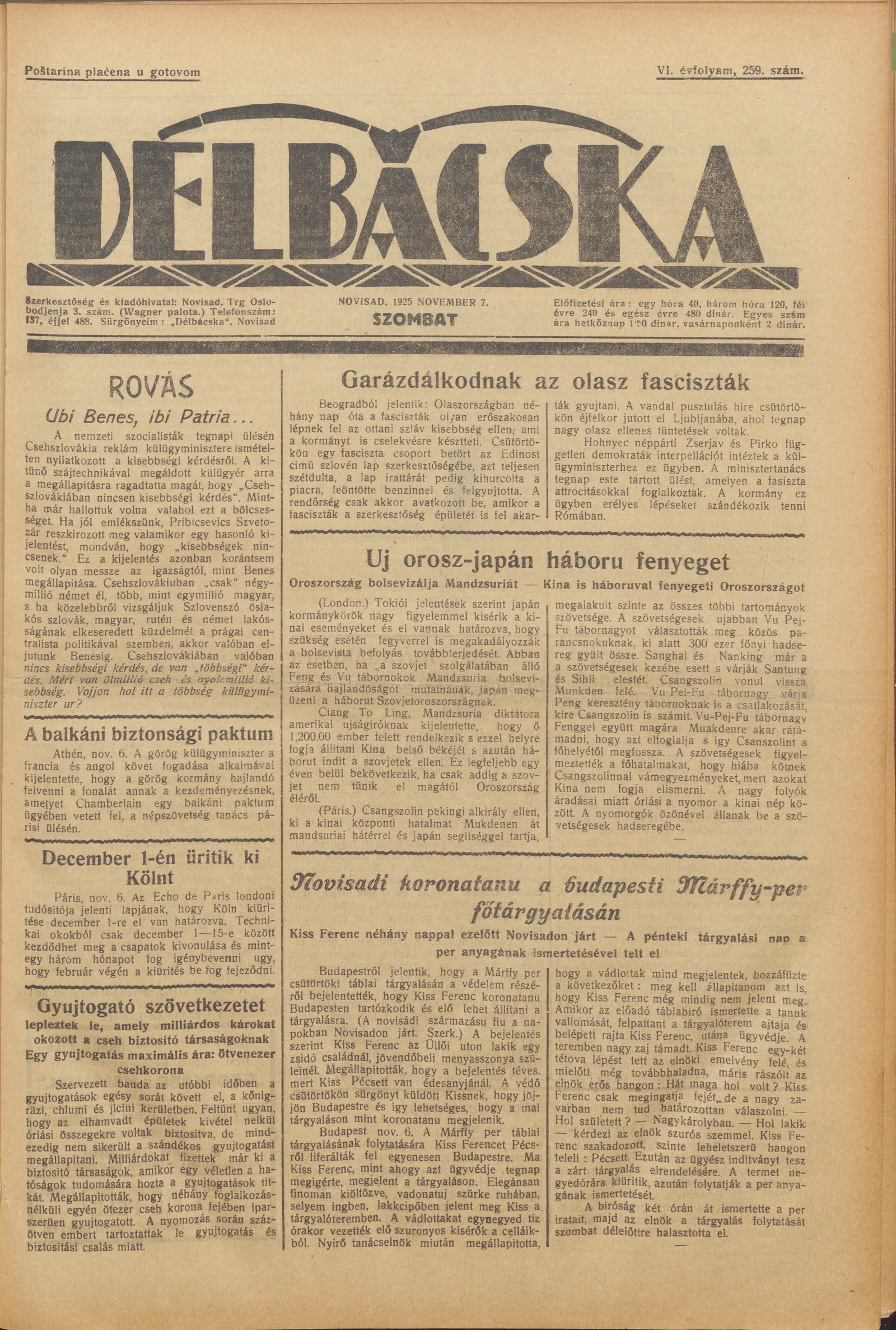 Délbácska, 6. évf. 1925. november 7. 259. sz.