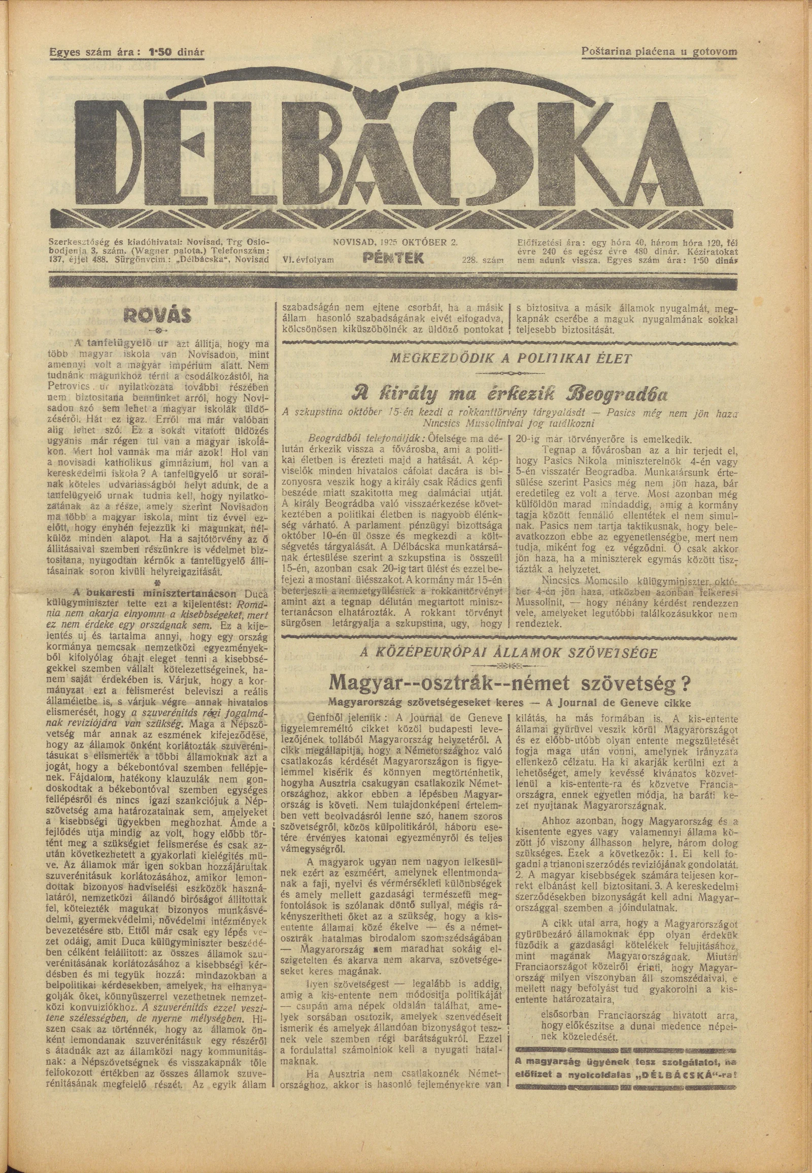 Délbácska, 6. évf. 1925. október 2. 228. sz.