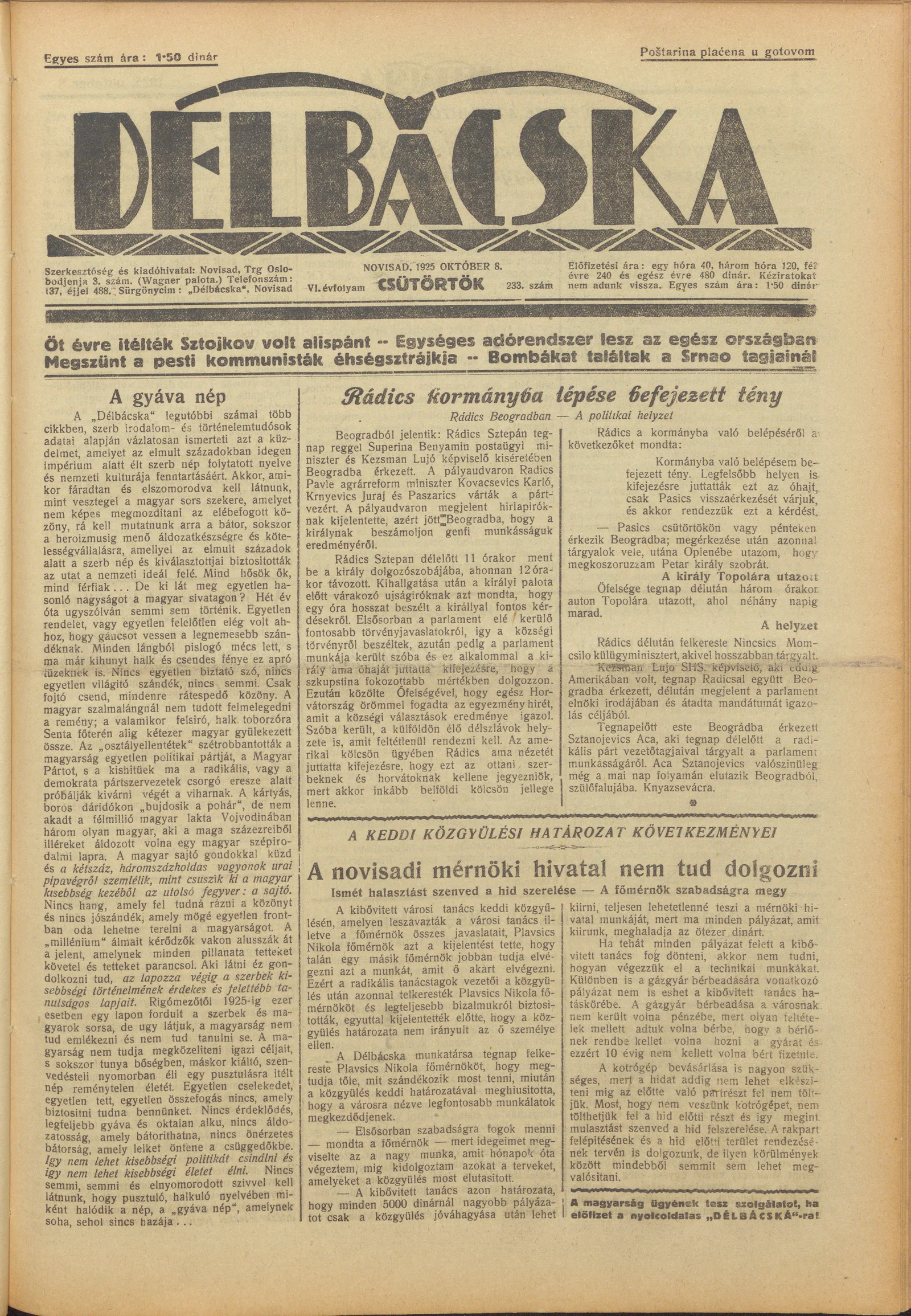 Délbácska, 6. évf. 1925. október 8. 233. sz.