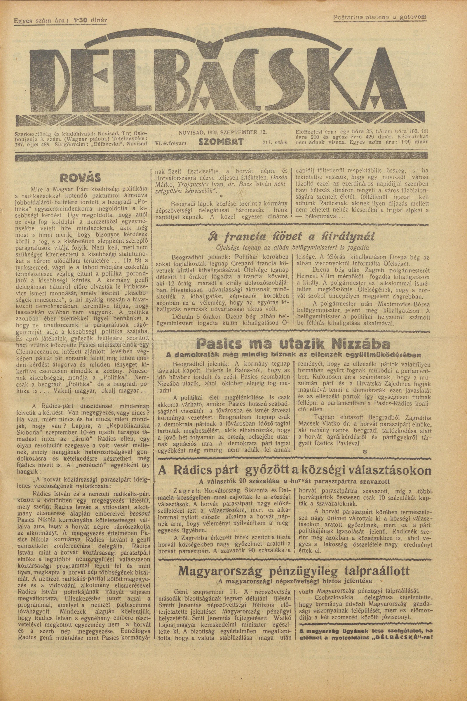 Délbácska, 6. évf. 1925. szeptember 12. 211. sz.