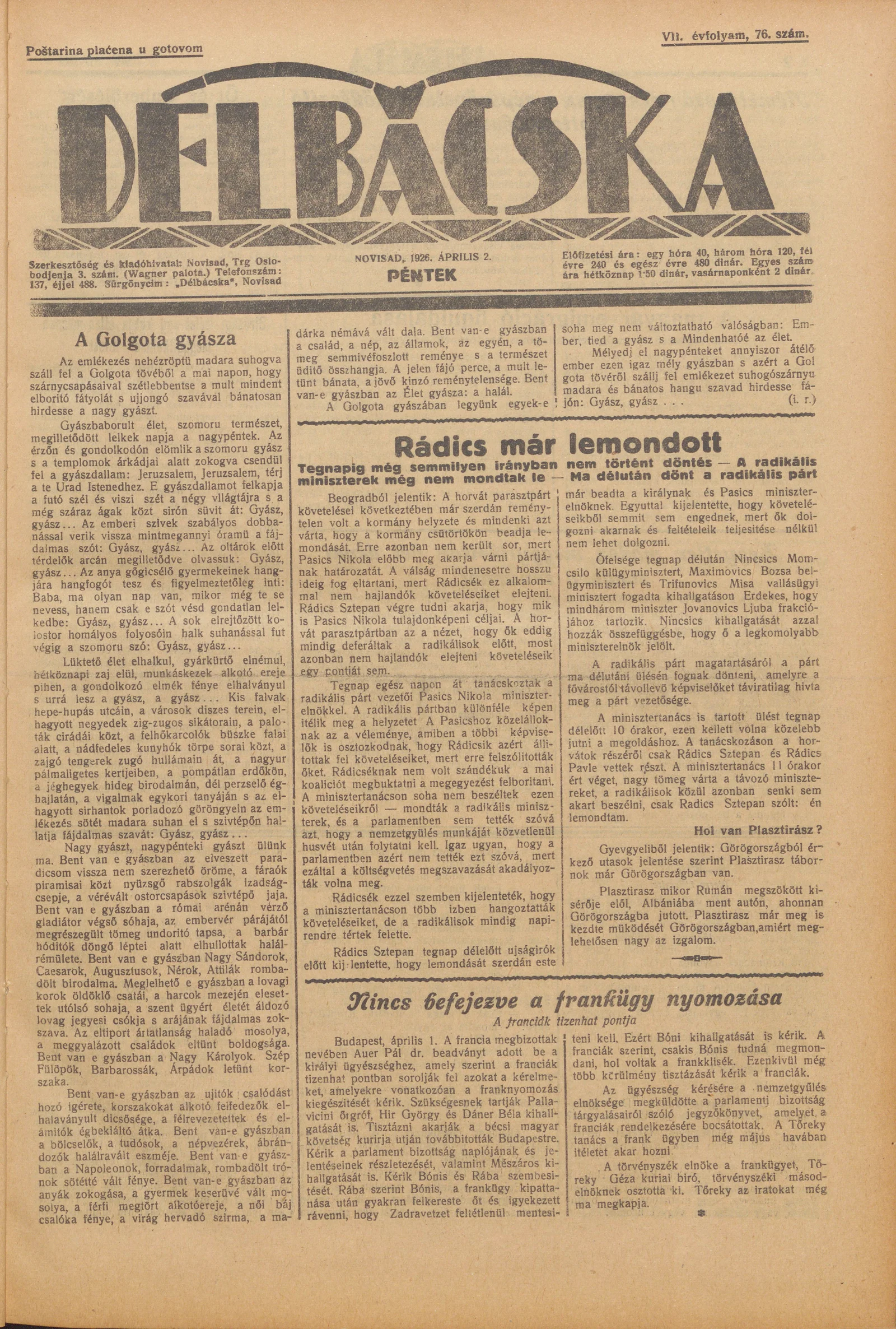 Délbácska, 7. évf. 1926. április 2. 76. sz.