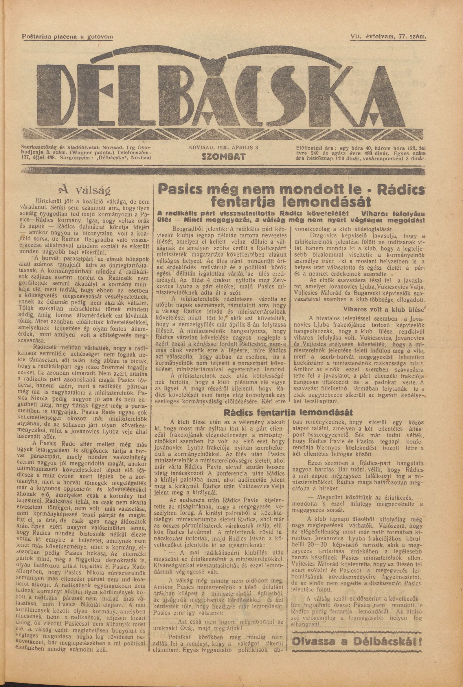 Délbácska, 7. évf. 1926. április 3. 77. sz.