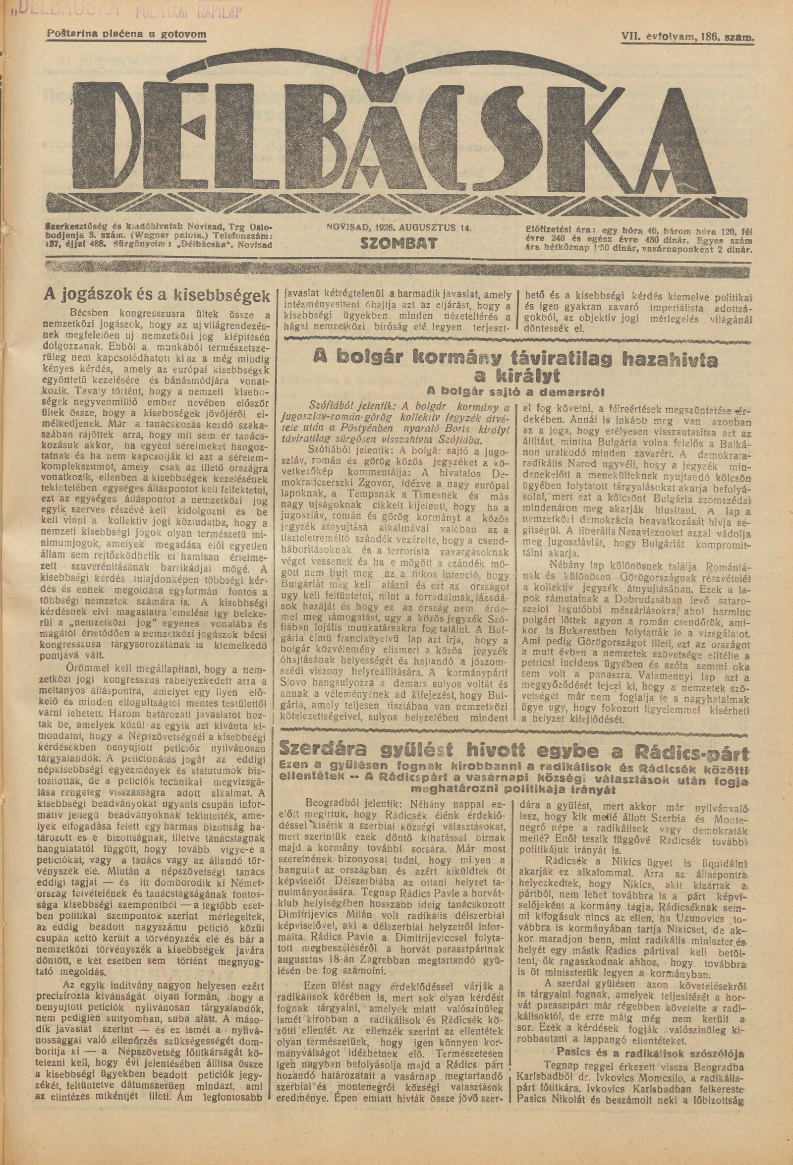 Délbácska, 7. évf. 1926. augusztus 14. 186. sz.