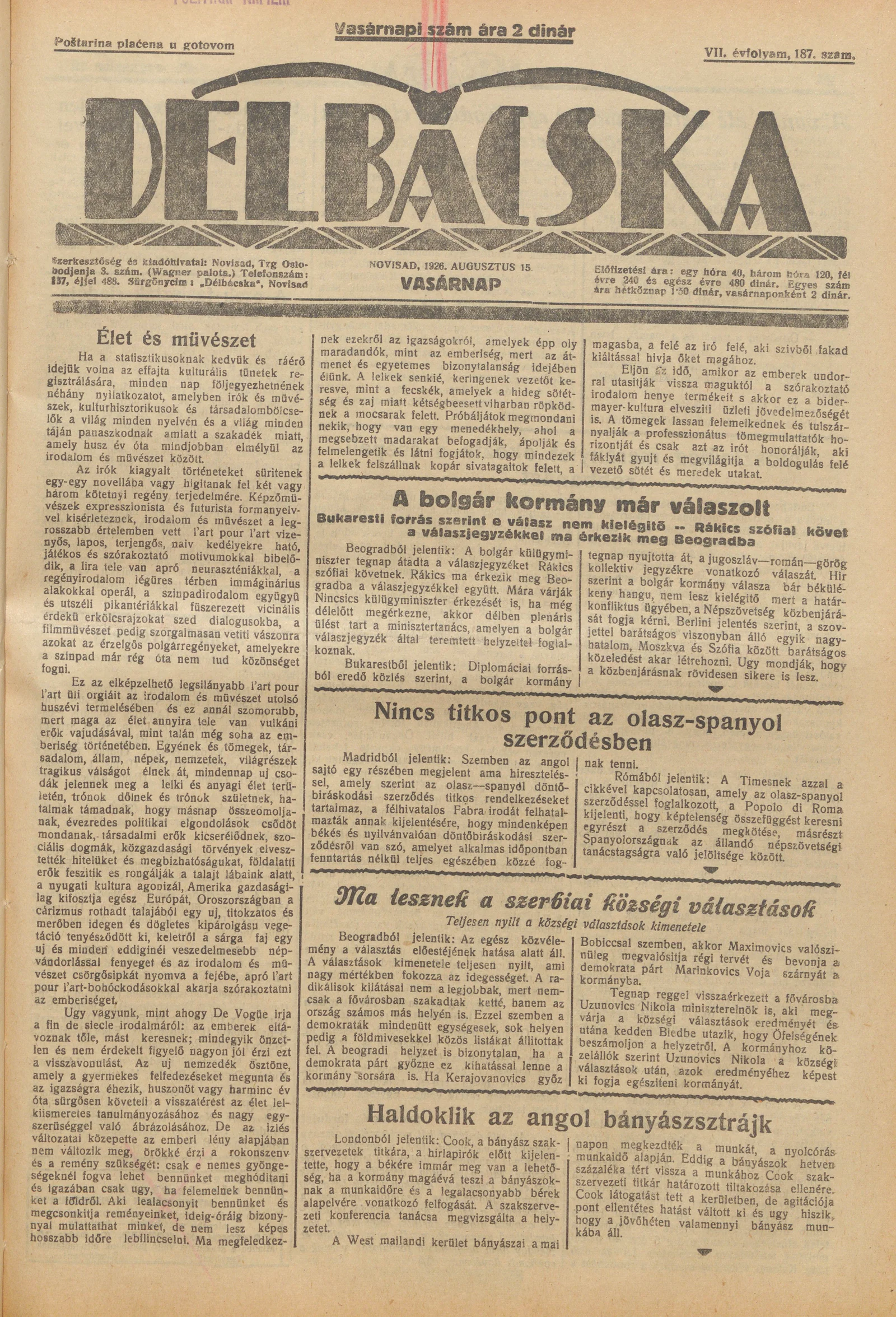 Délbácska, 7. évf. 1926. augusztus 15. 187. sz.