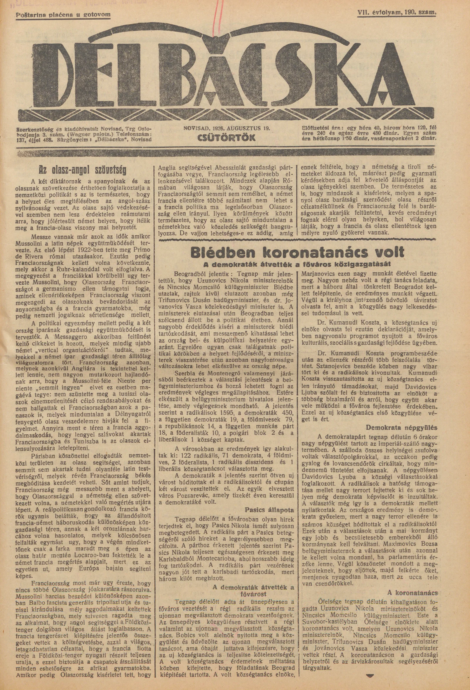 Délbácska, 7. évf. 1926. augusztus 19. 190. sz.
