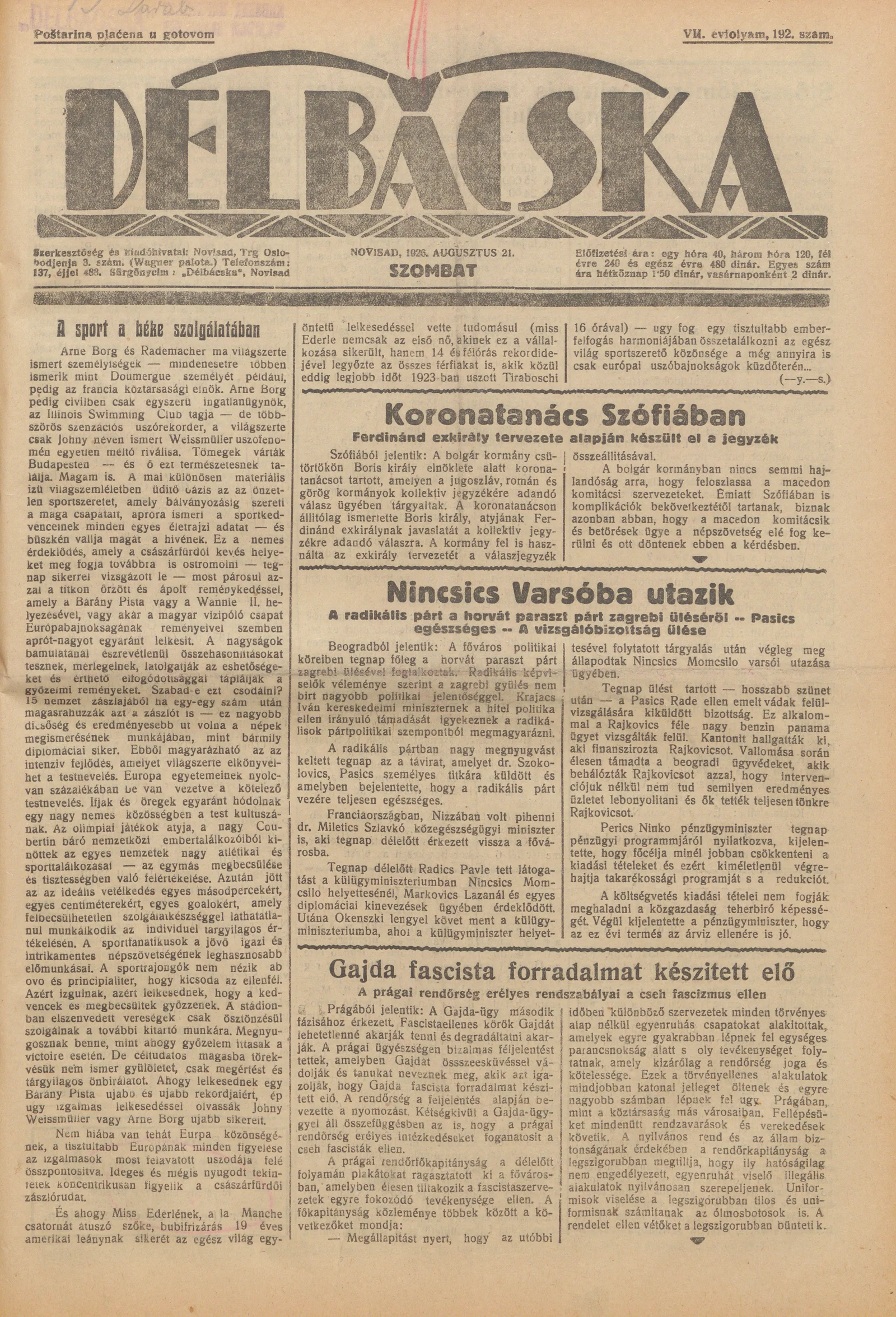 Délbácska, 7. évf. 1926. augusztus 21. 192. sz.