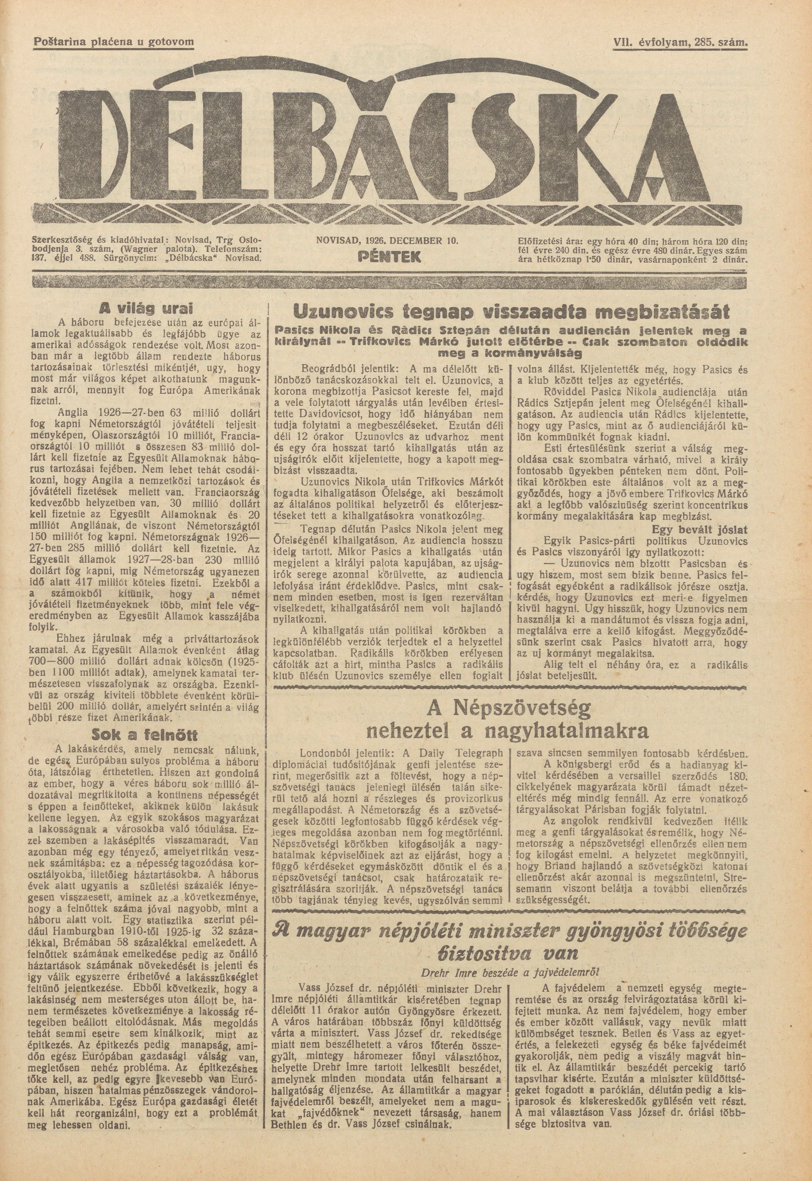Délbácska, 7. évf. 1926. december 10. 285. sz.