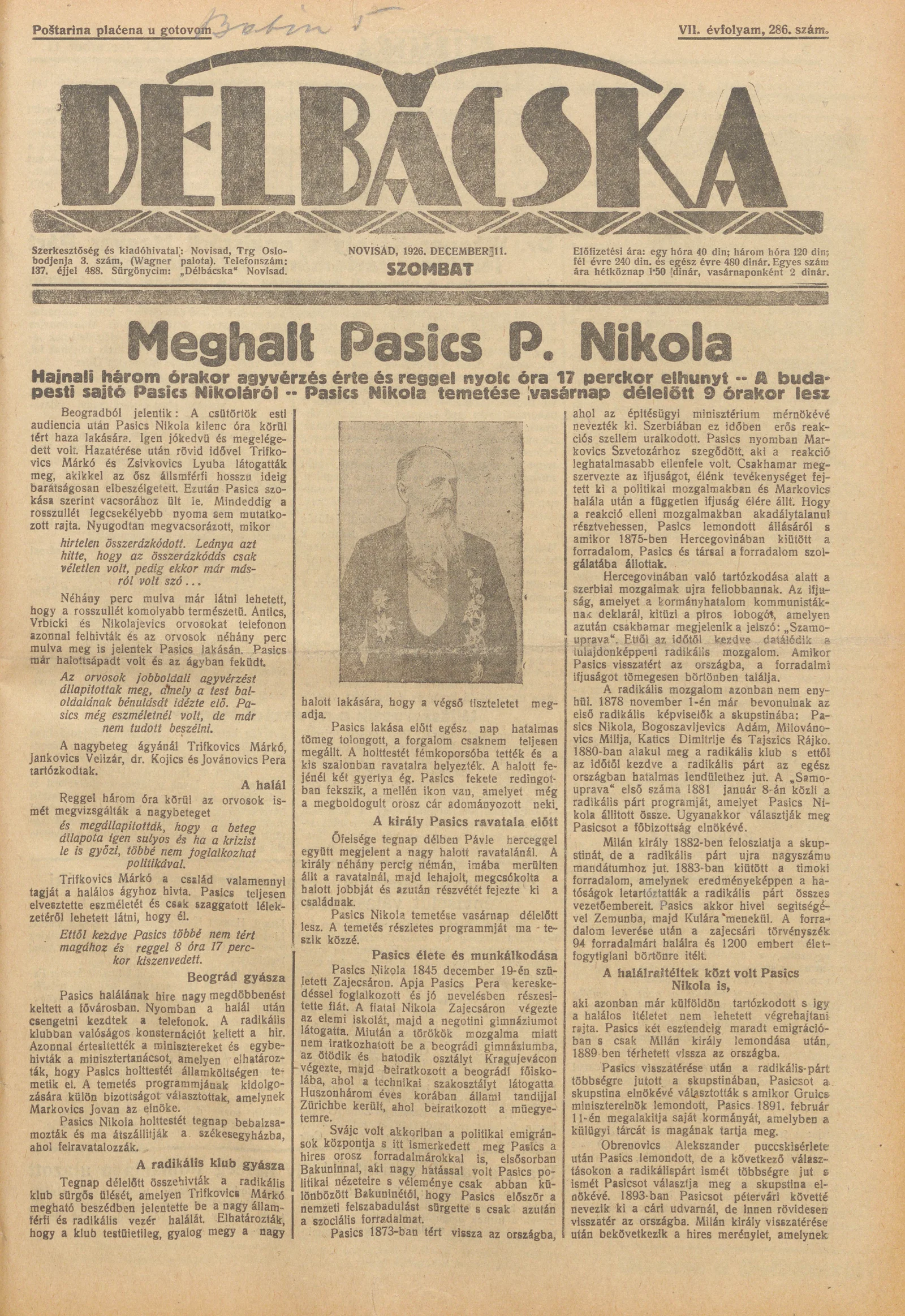 Délbácska, 7. évf. 1926. december 11. 286. sz.