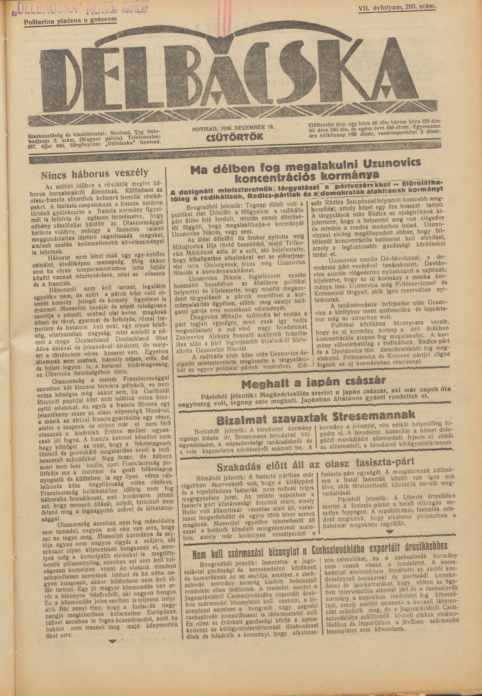 Délbácska, 7. évf. 1926. december 16. 290. sz.