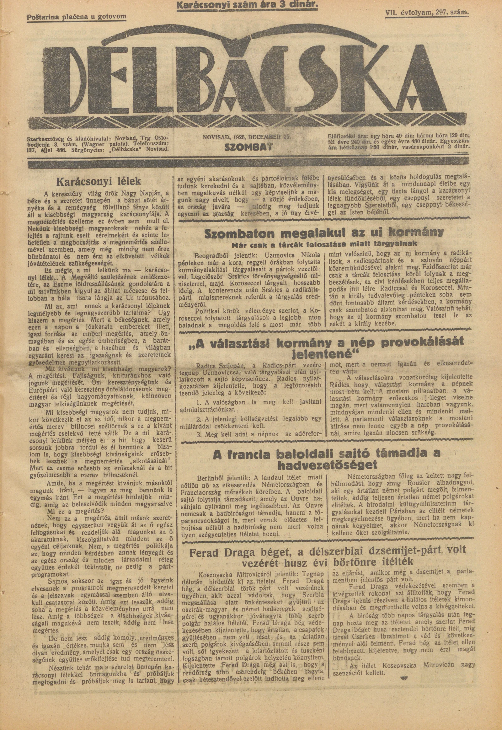 Délbácska, 7. évf. 1926. december 25. 297. sz.