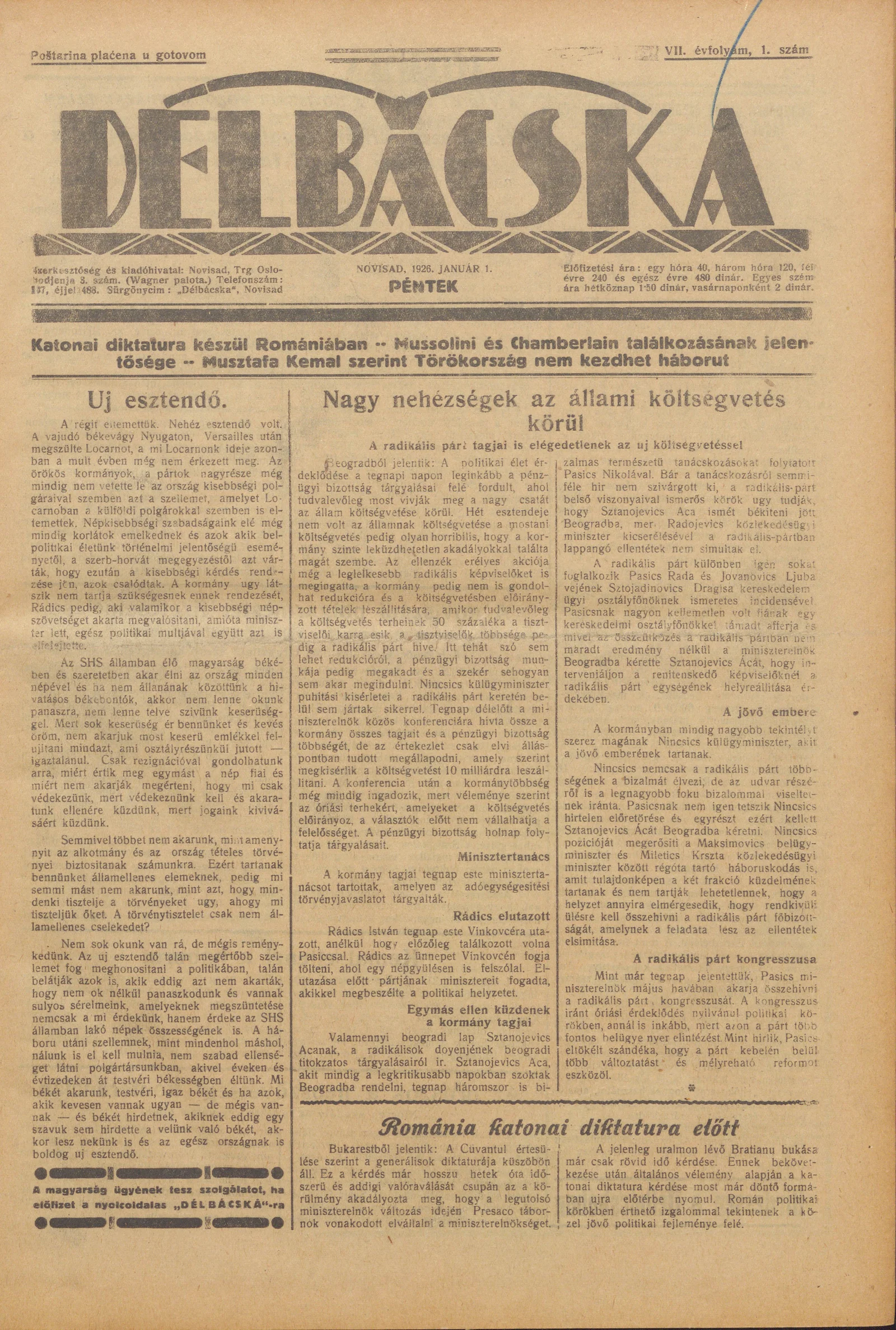 Délbácska, 7. évf. 1926. január 1. 1. sz.