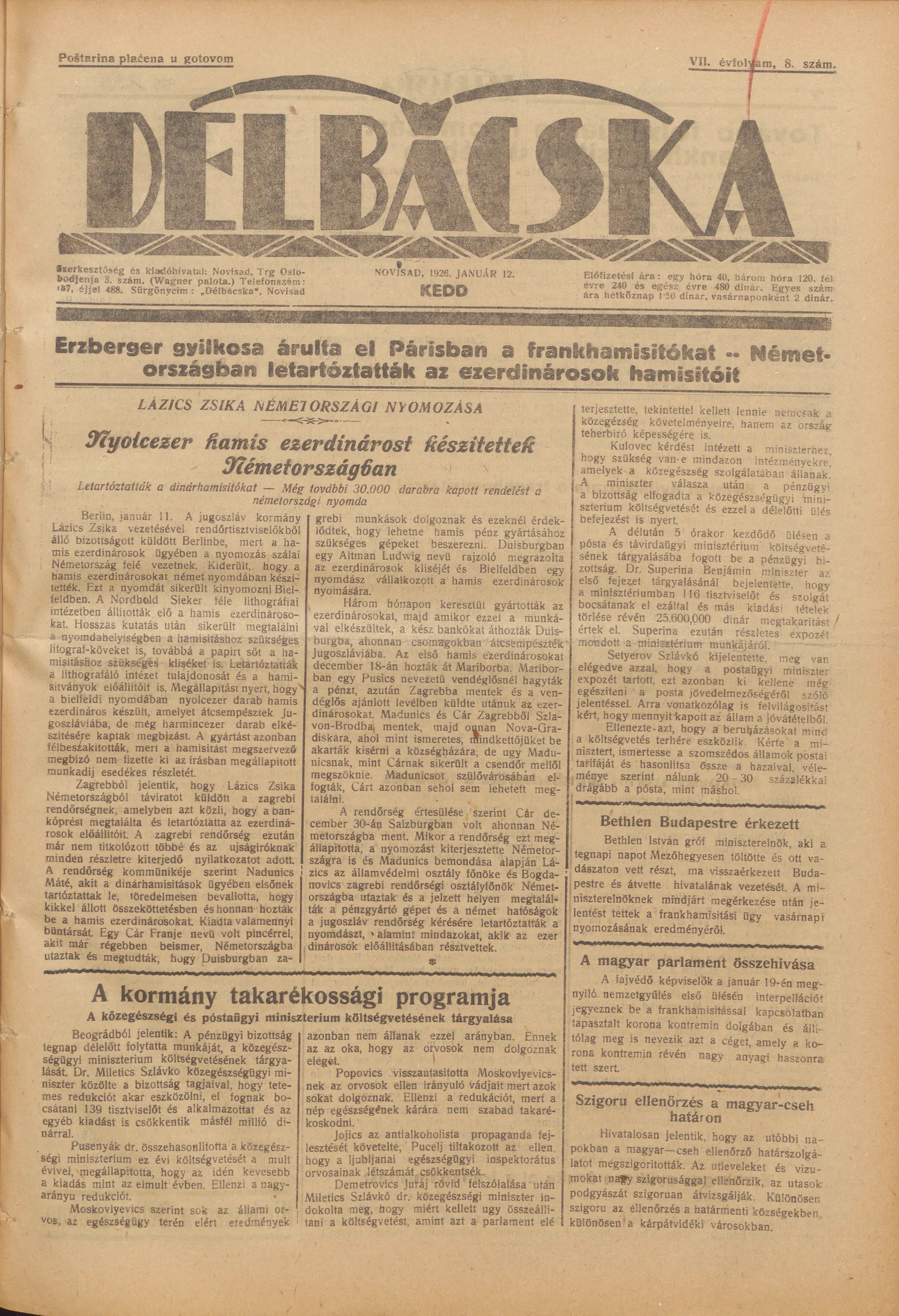 Délbácska, 7. évf. 1926. január 12. 8. sz.