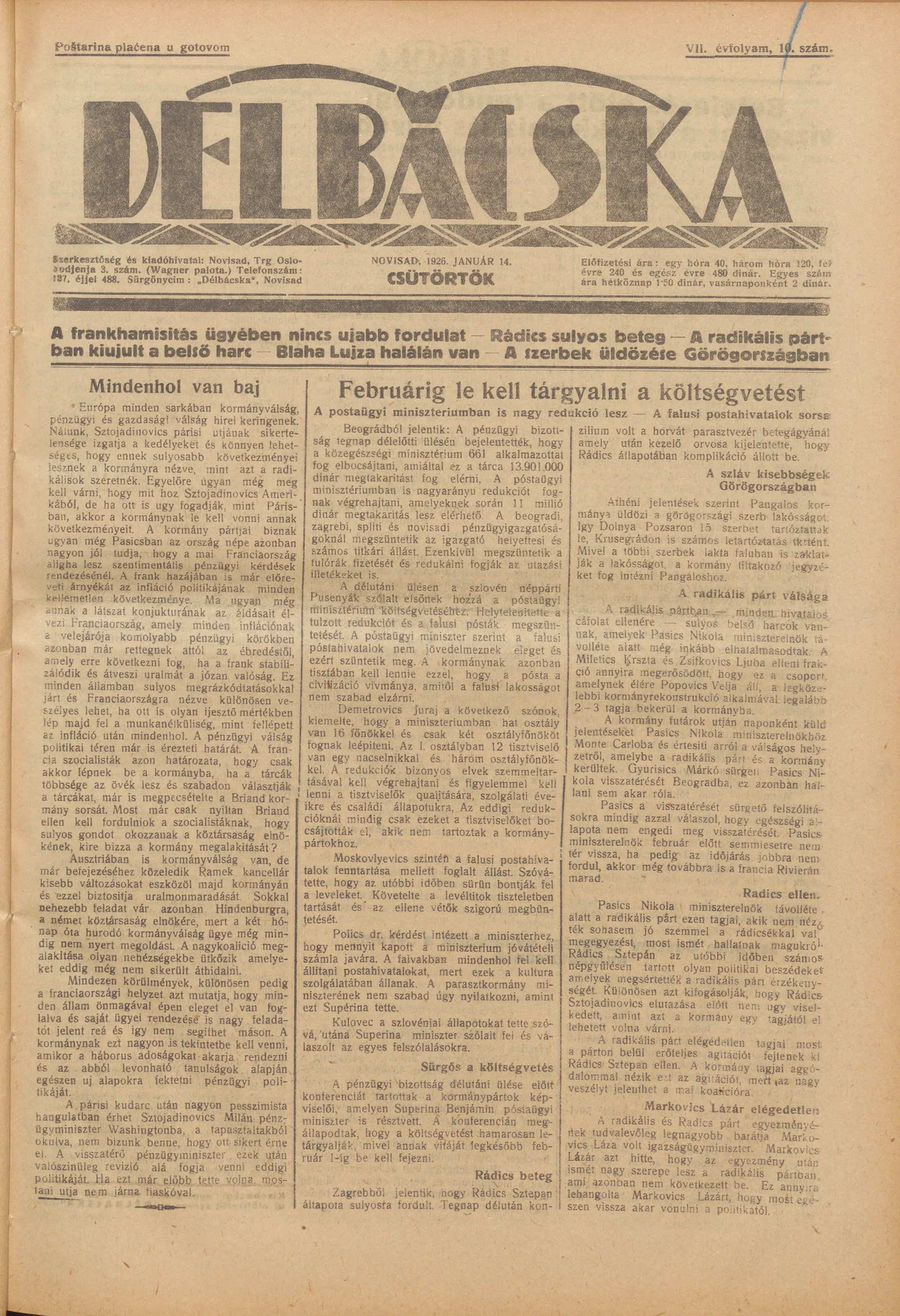 Délbácska, 7. évf. 1926. január 14. 10. sz.