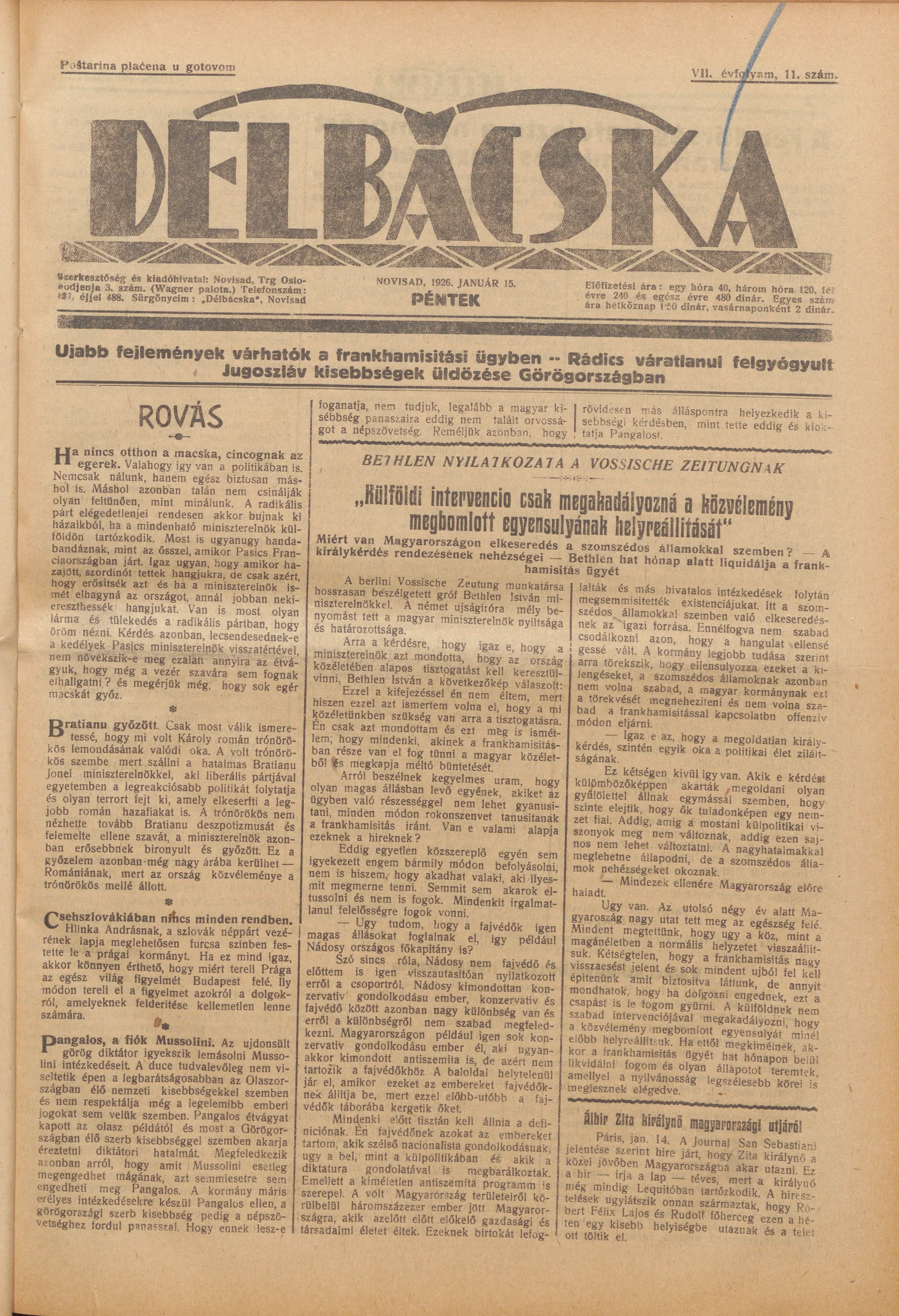 Délbácska, 7. évf. 1926. január 15. 11. sz.