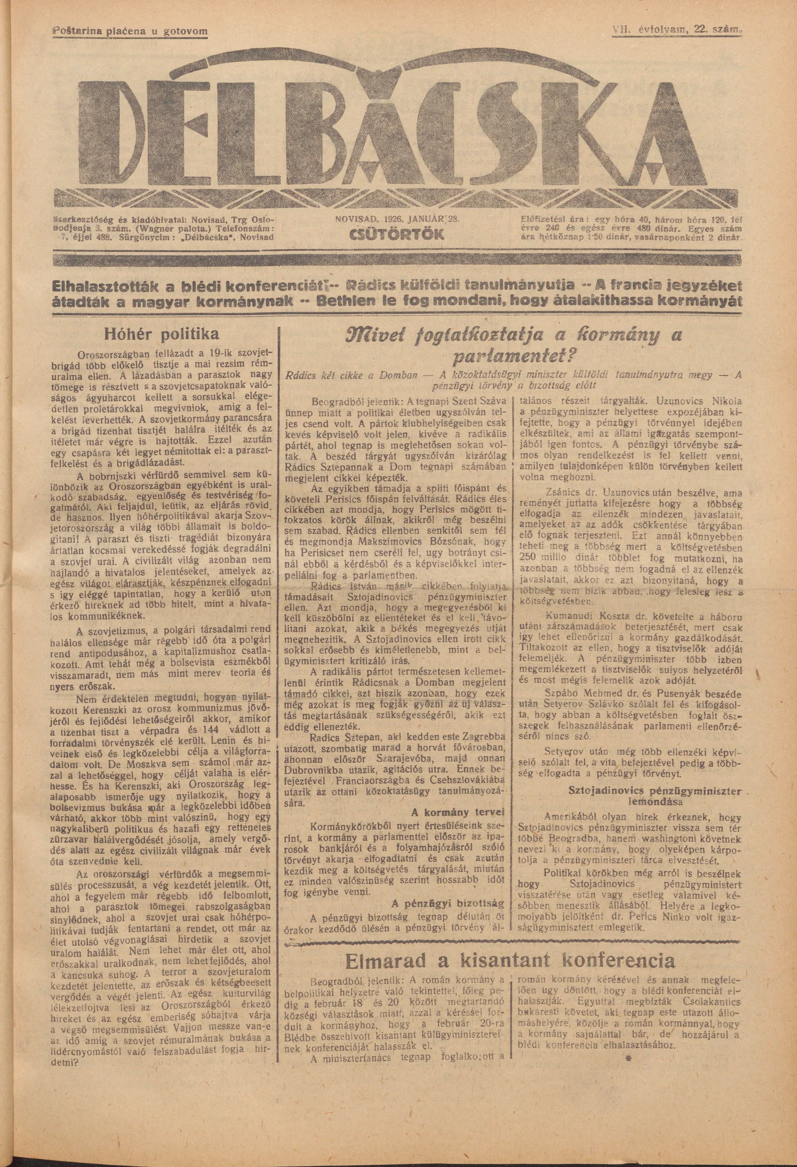 Délbácska, 7. évf. 1926. január 28. 22. sz.