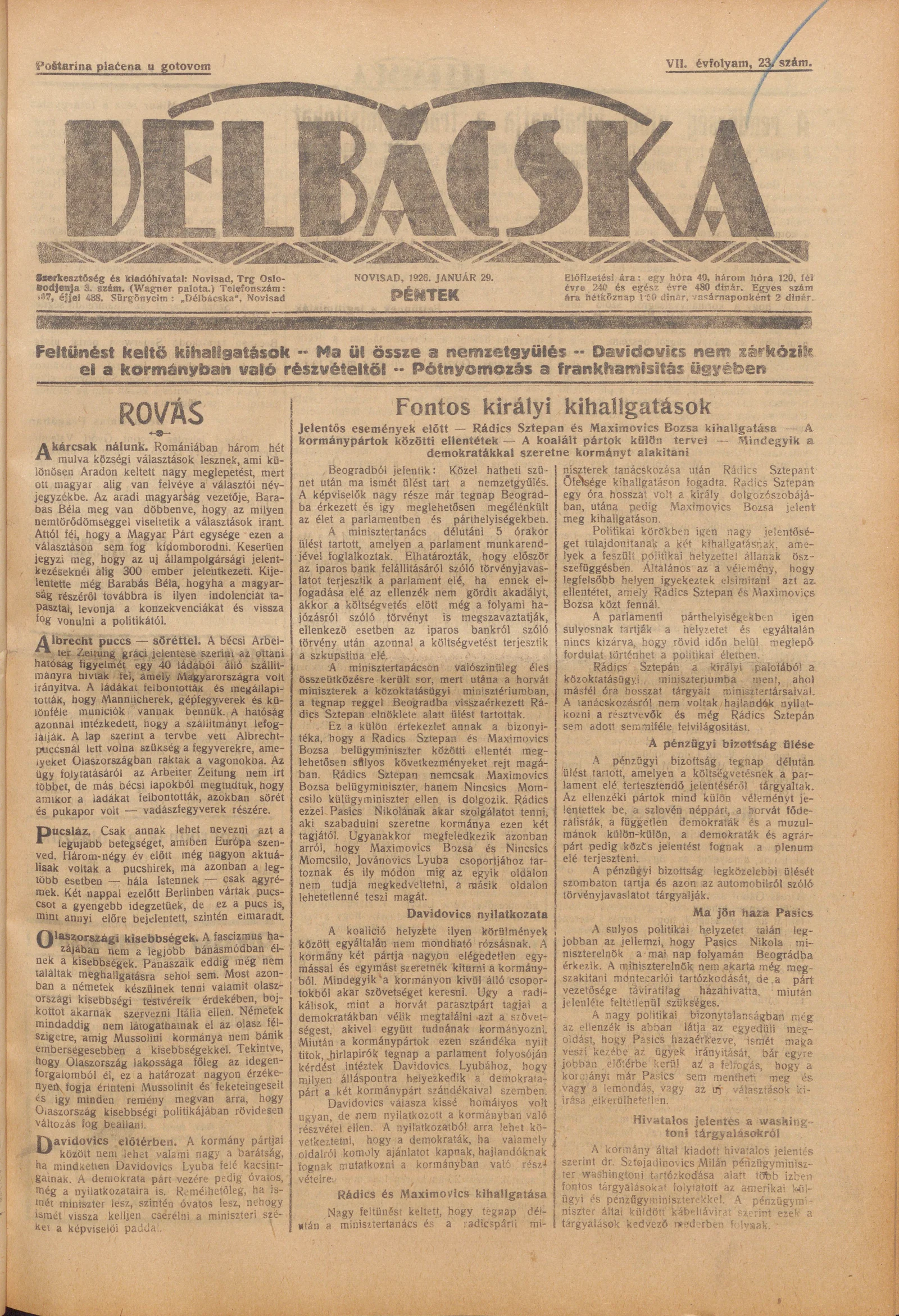 Délbácska, 7. évf. 1926. január 29. 23. sz.