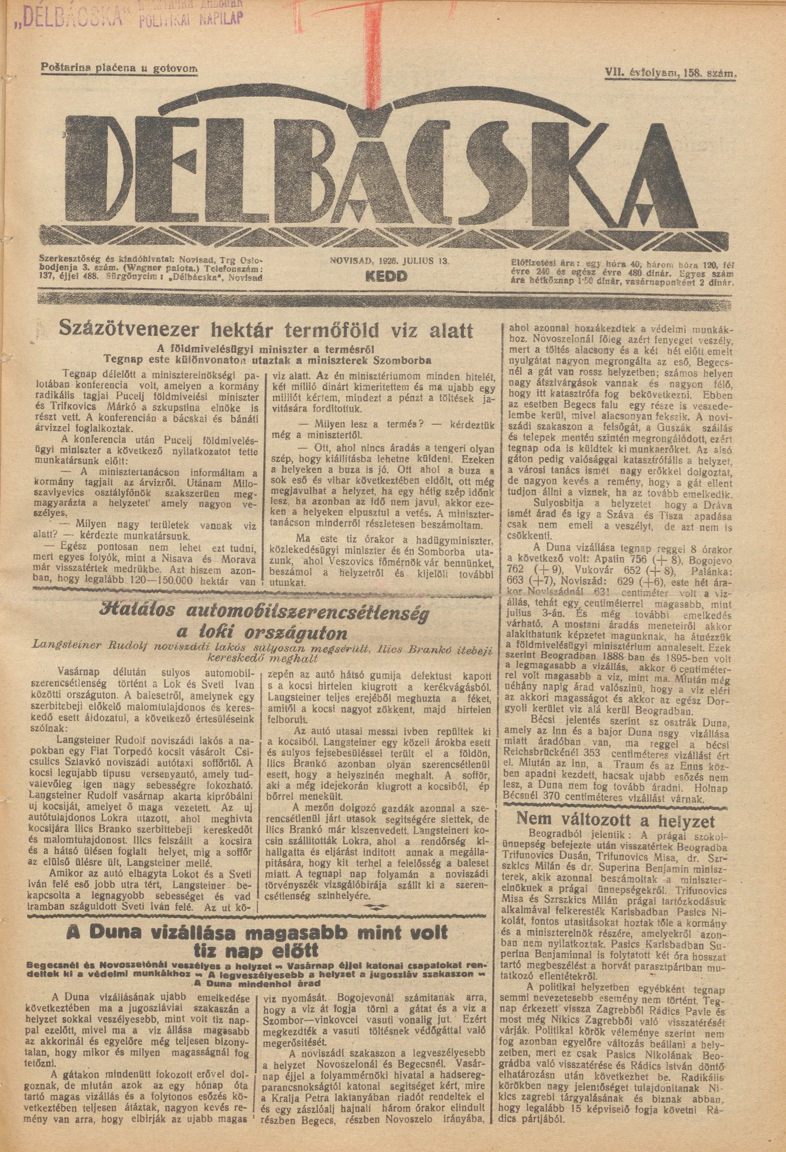 Délbácska, 7. évf. 1926. július 13. 158. sz.
