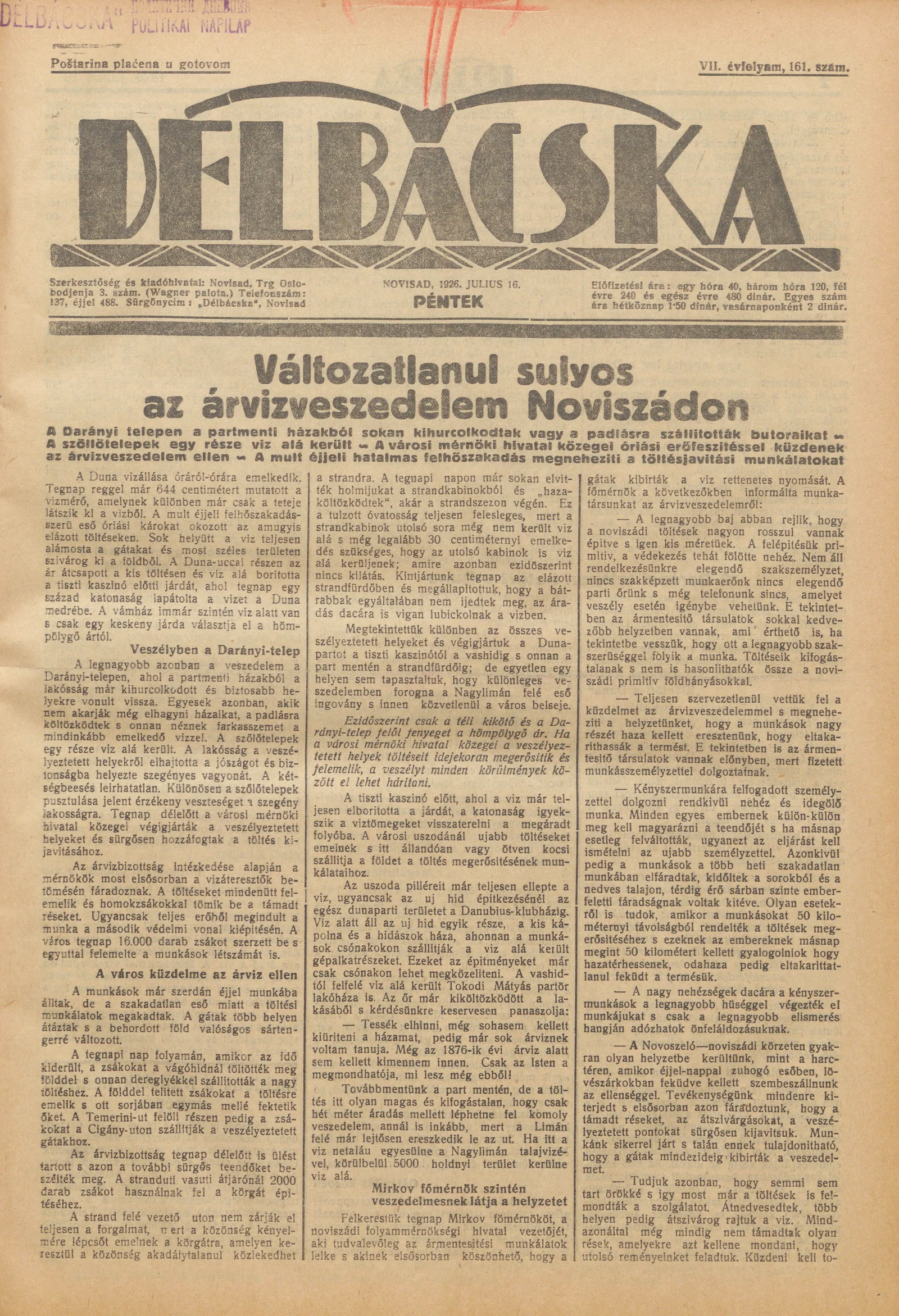 Délbácska, 7. évf. 1926. július 16. 161. sz.