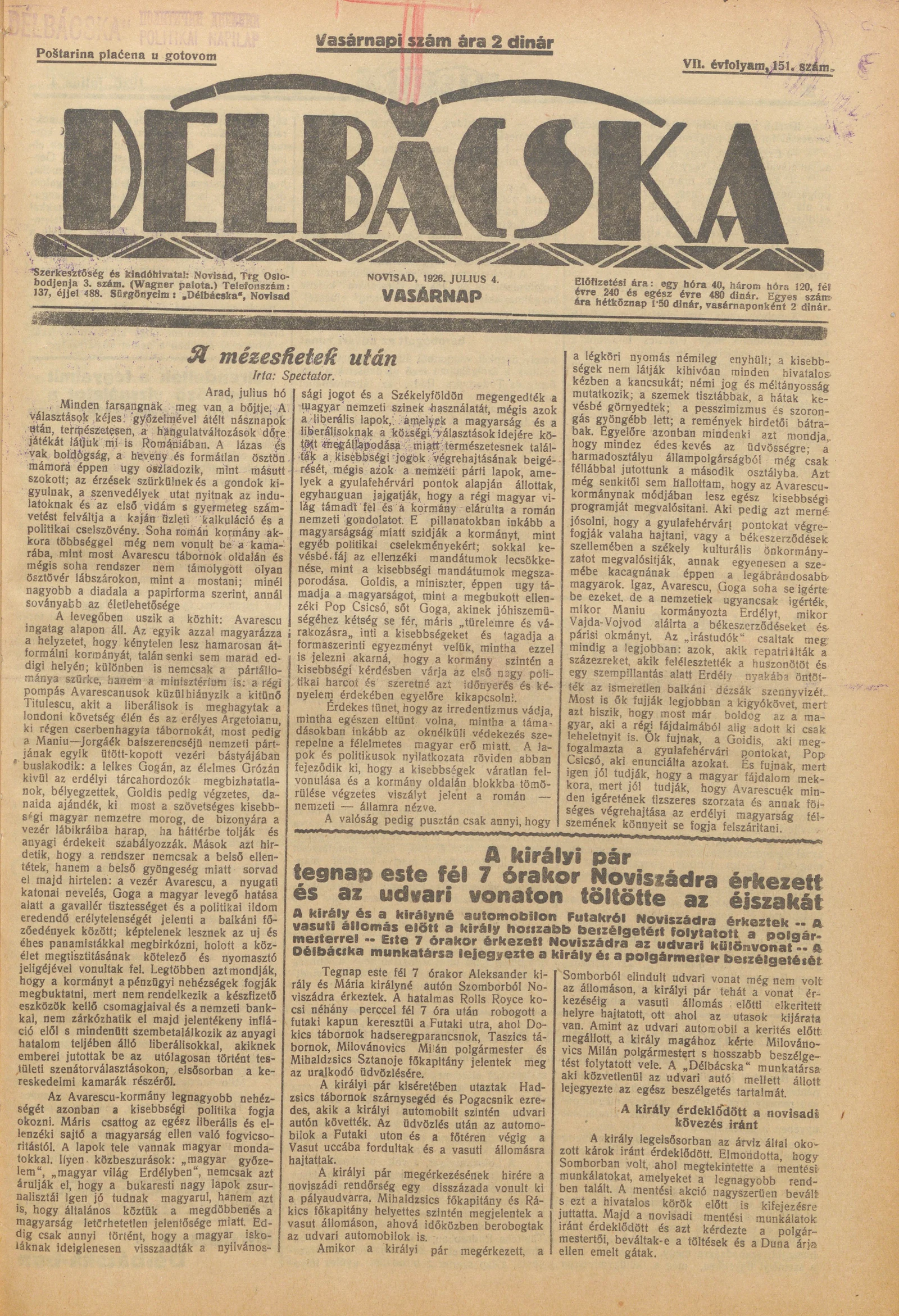 Délbácska, 7. évf. 1926. július 4. 151. sz.