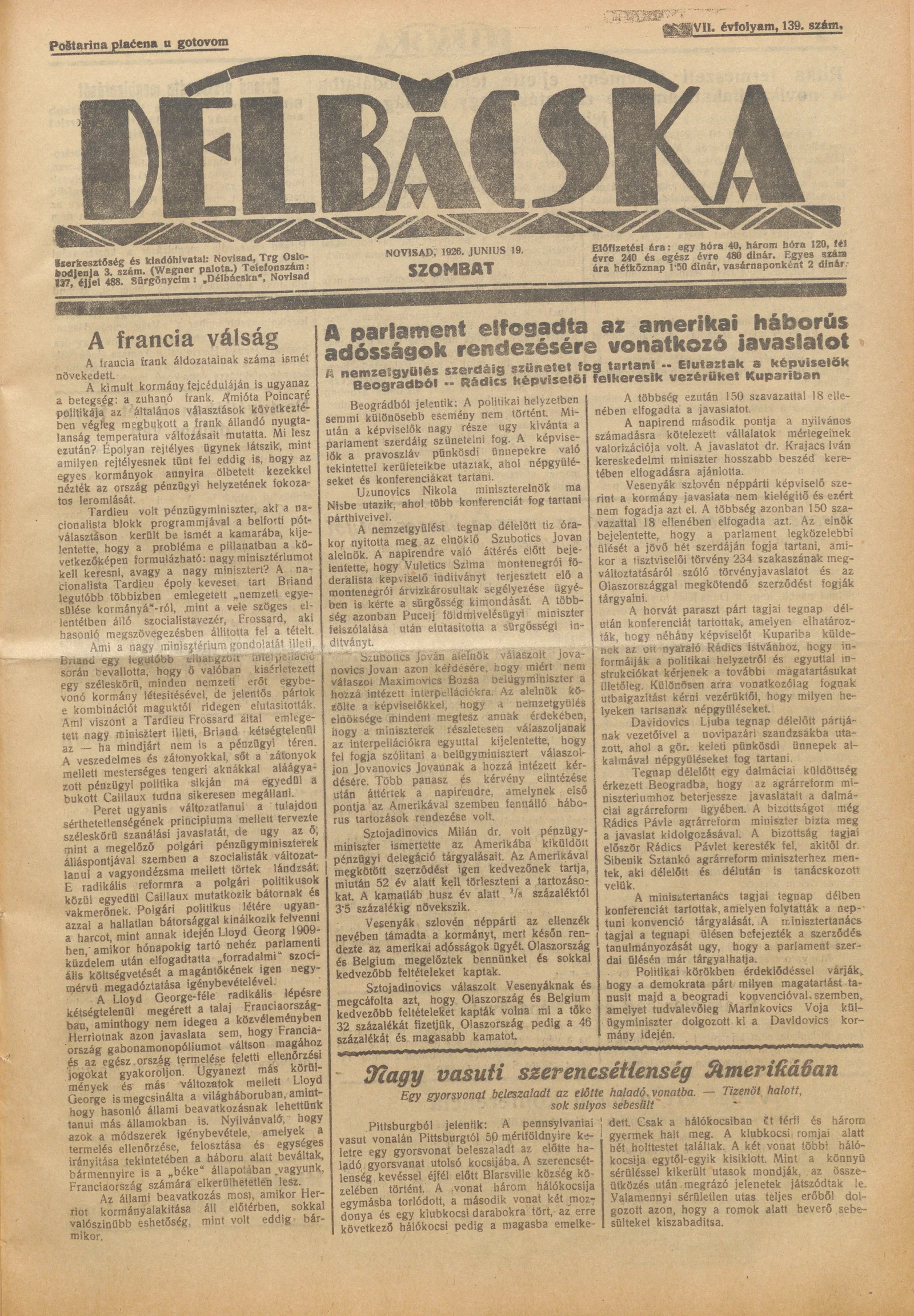Délbácska, 7. évf. 1926. június 19. 139. sz.