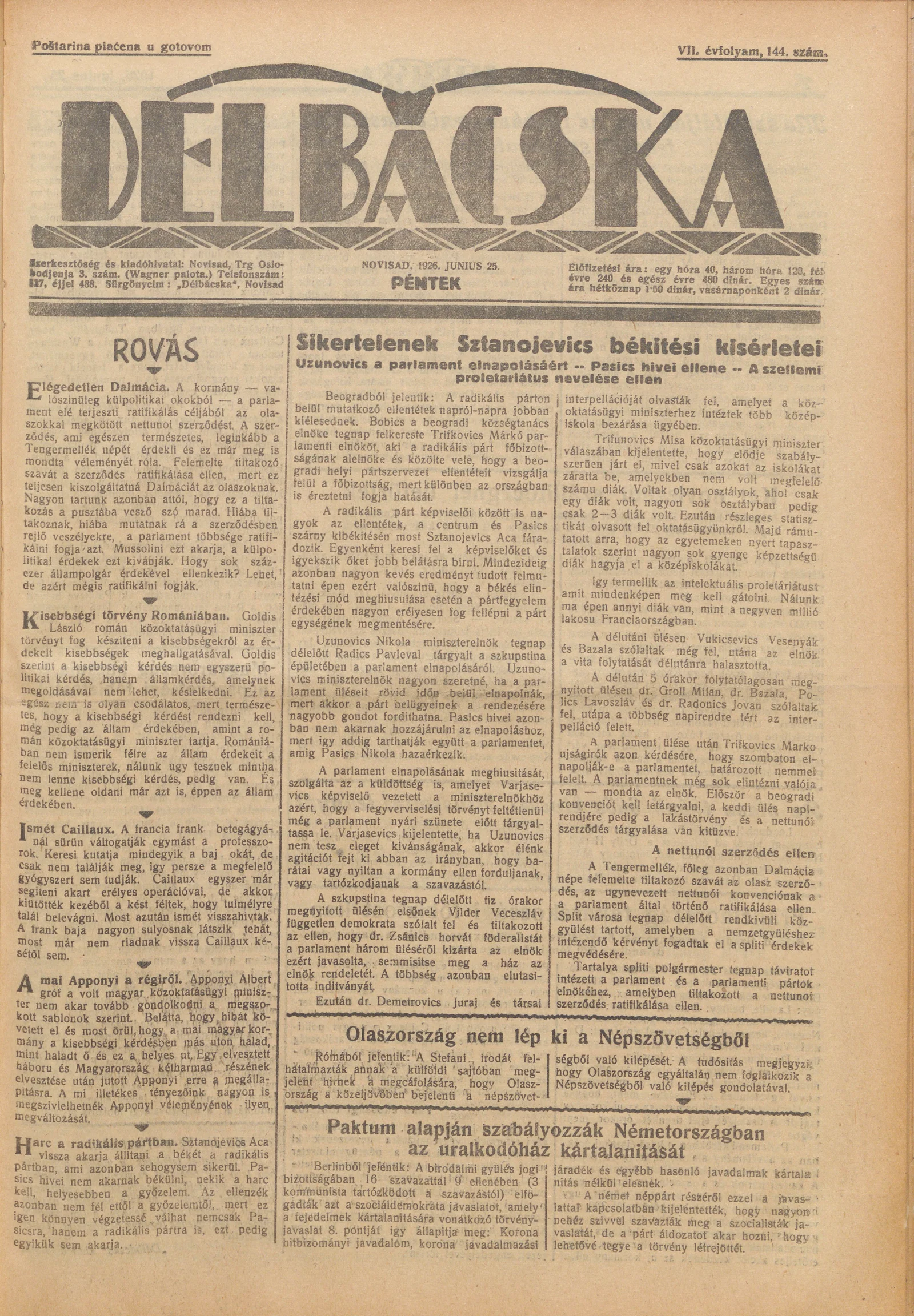 Délbácska, 7. évf. 1926. június 25. 144. sz.