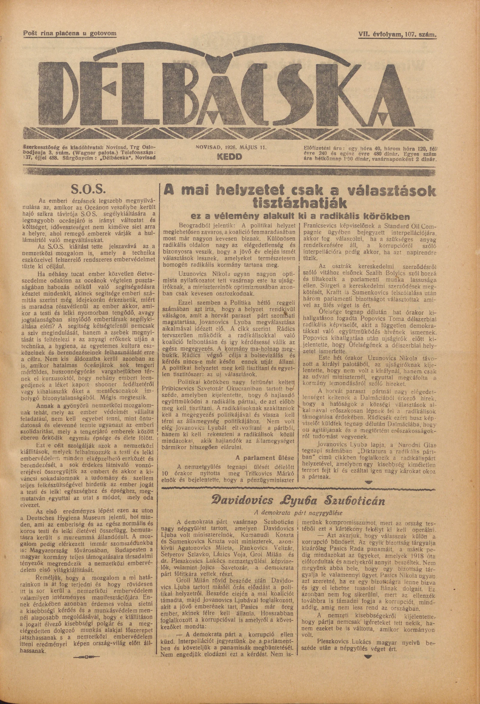Délbácska, 7. évf. 1926. május 11. 107. sz.