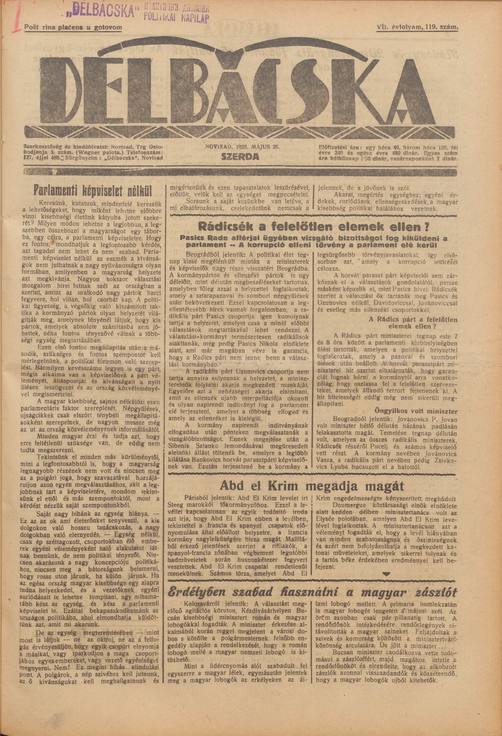 Délbácska, 7. évf. 1926. május 26. 119. sz.
