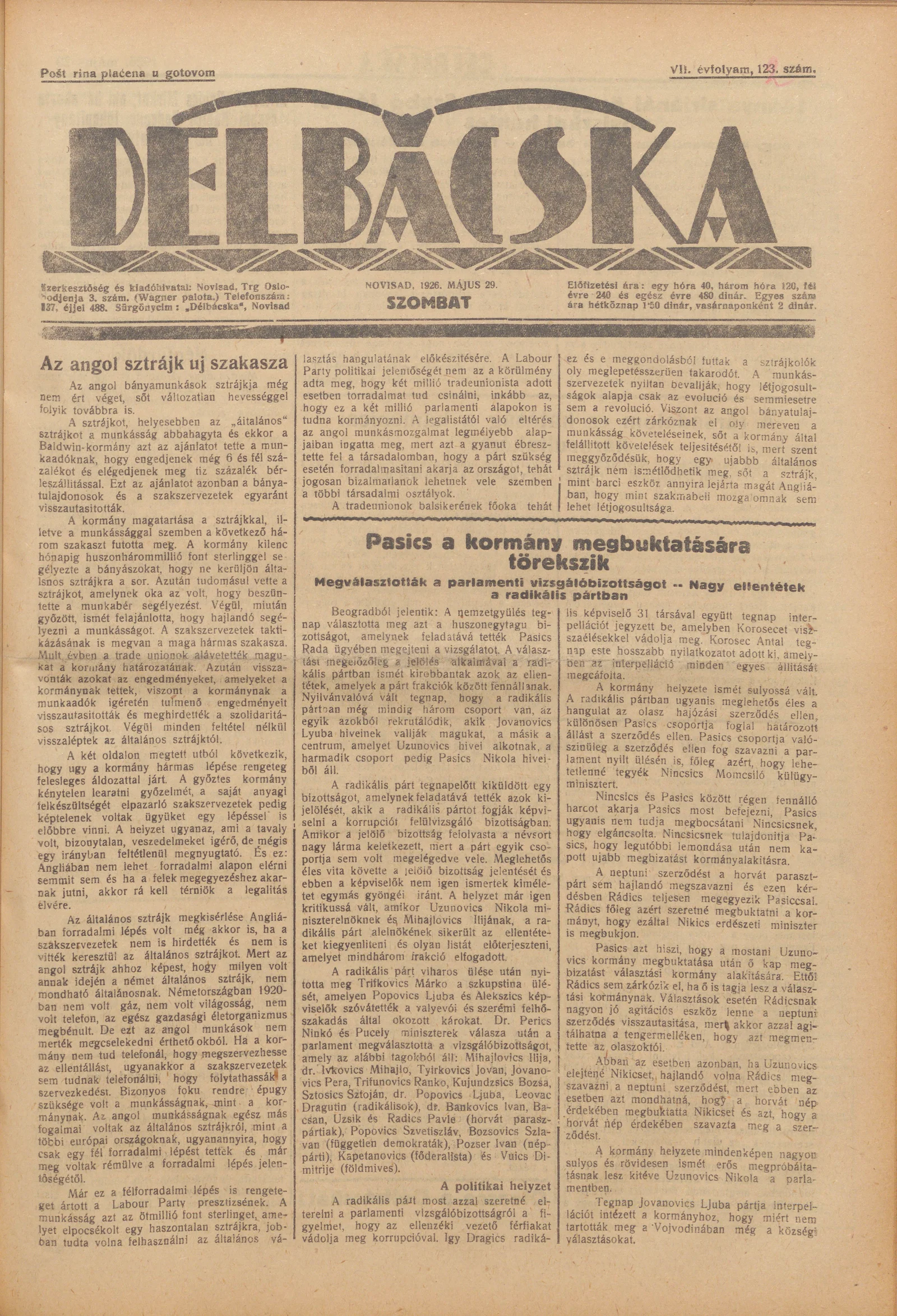Délbácska, 7. évf. 1926. május 29. 122. sz.