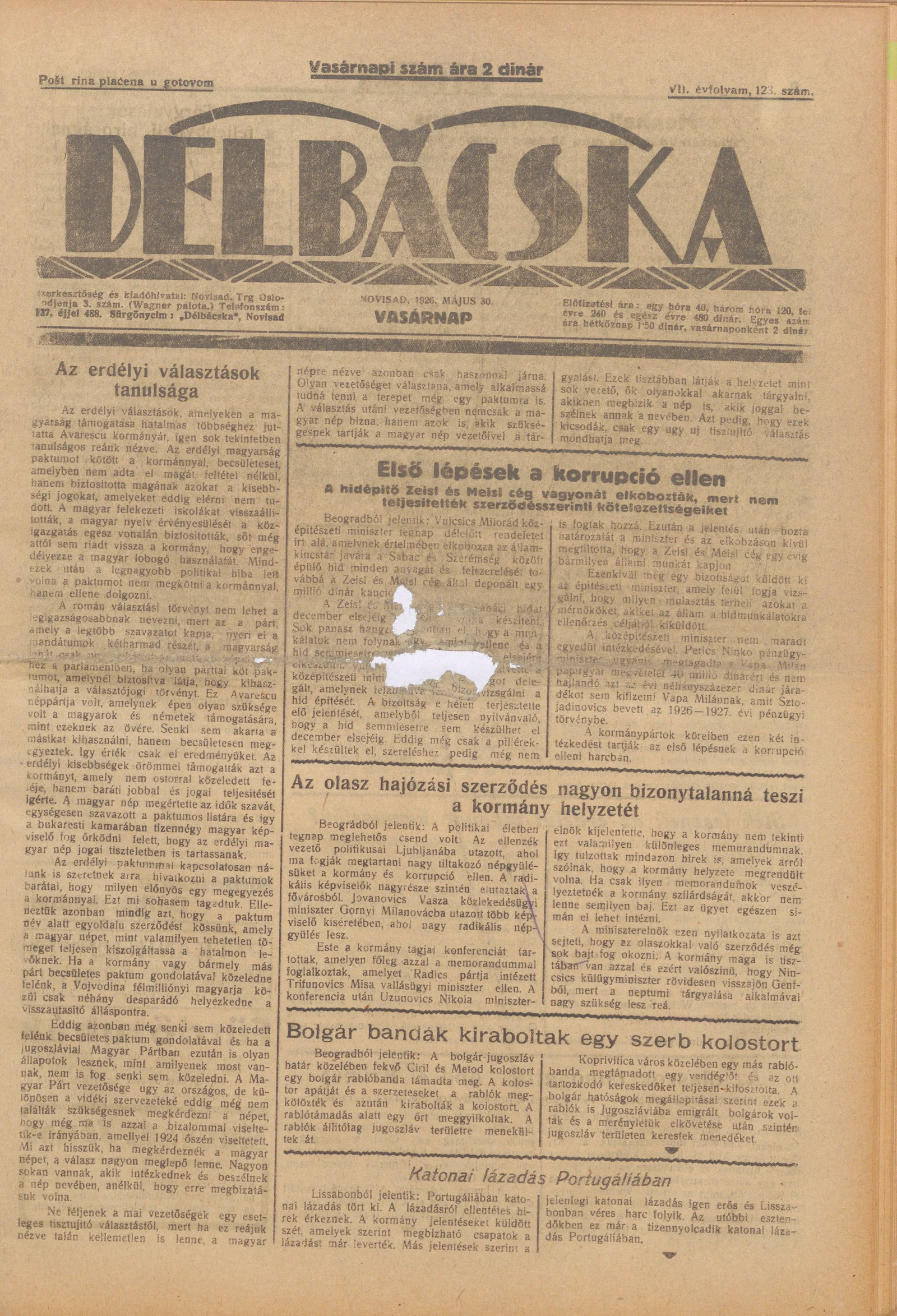 Délbácska, 7. évf. 1926. május 30. 123. sz.
