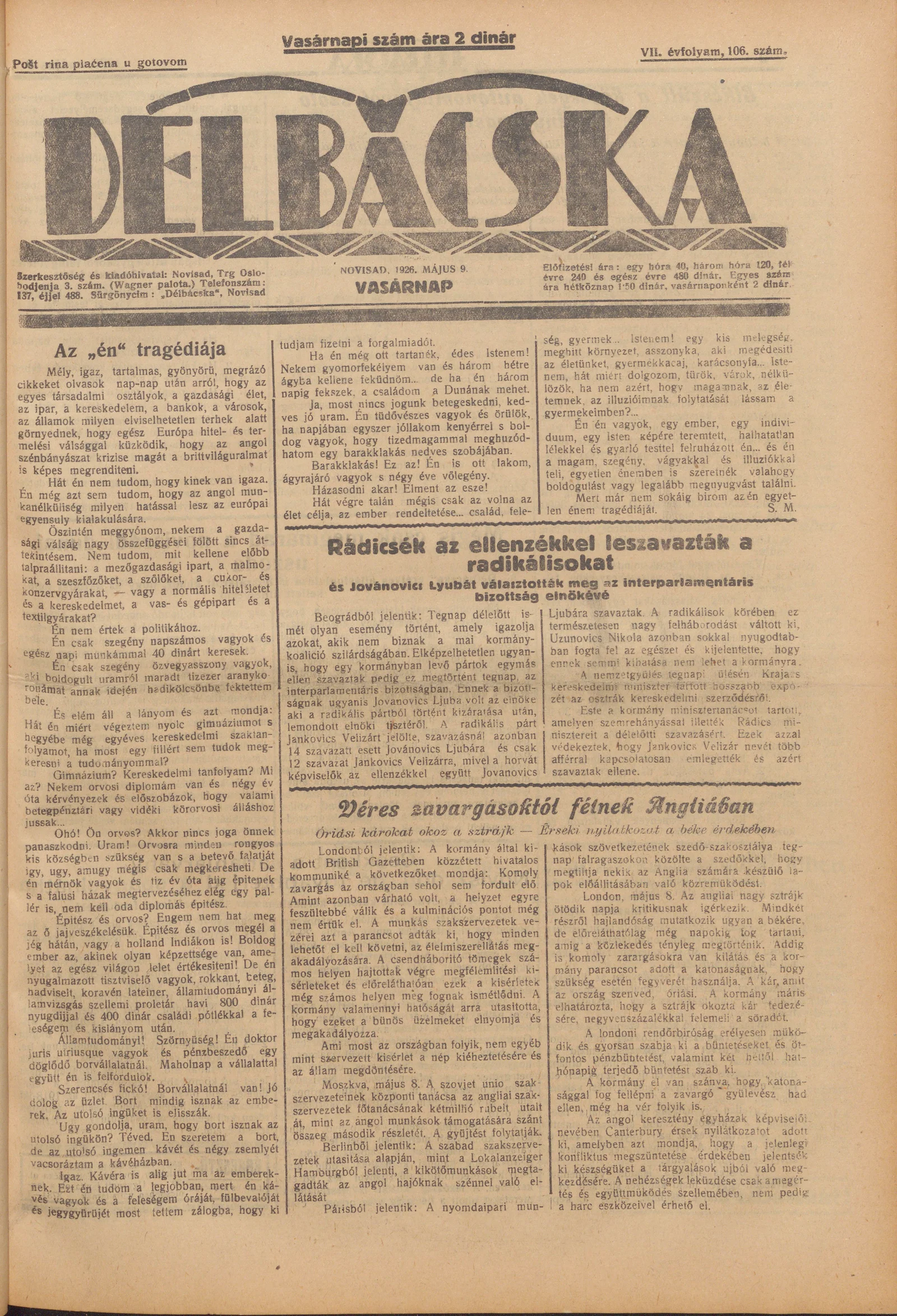 Délbácska, 7. évf. 1926. május 9. 106. sz.