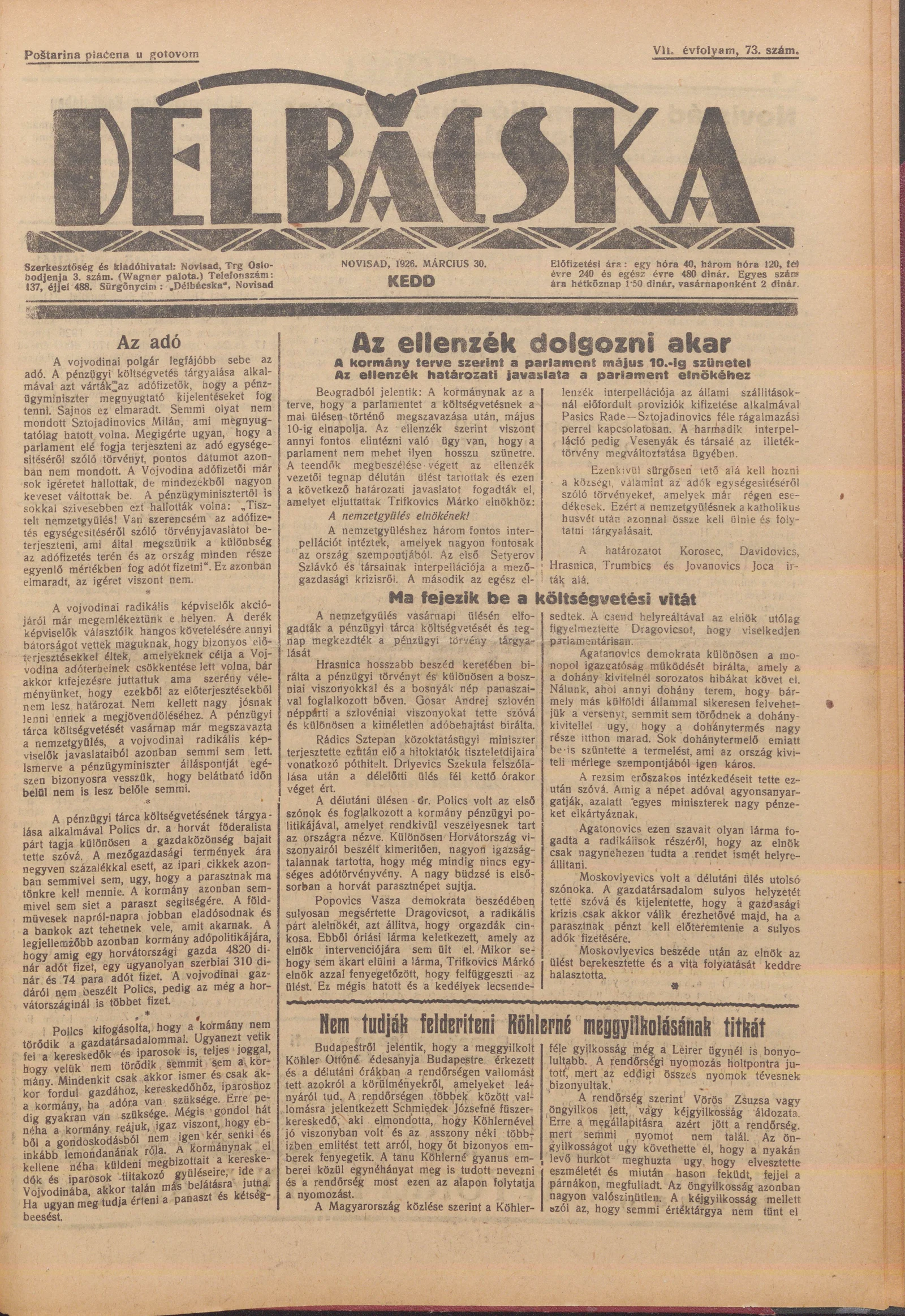 Délbácska, 7. évf. 1926. március 30. 73. sz.