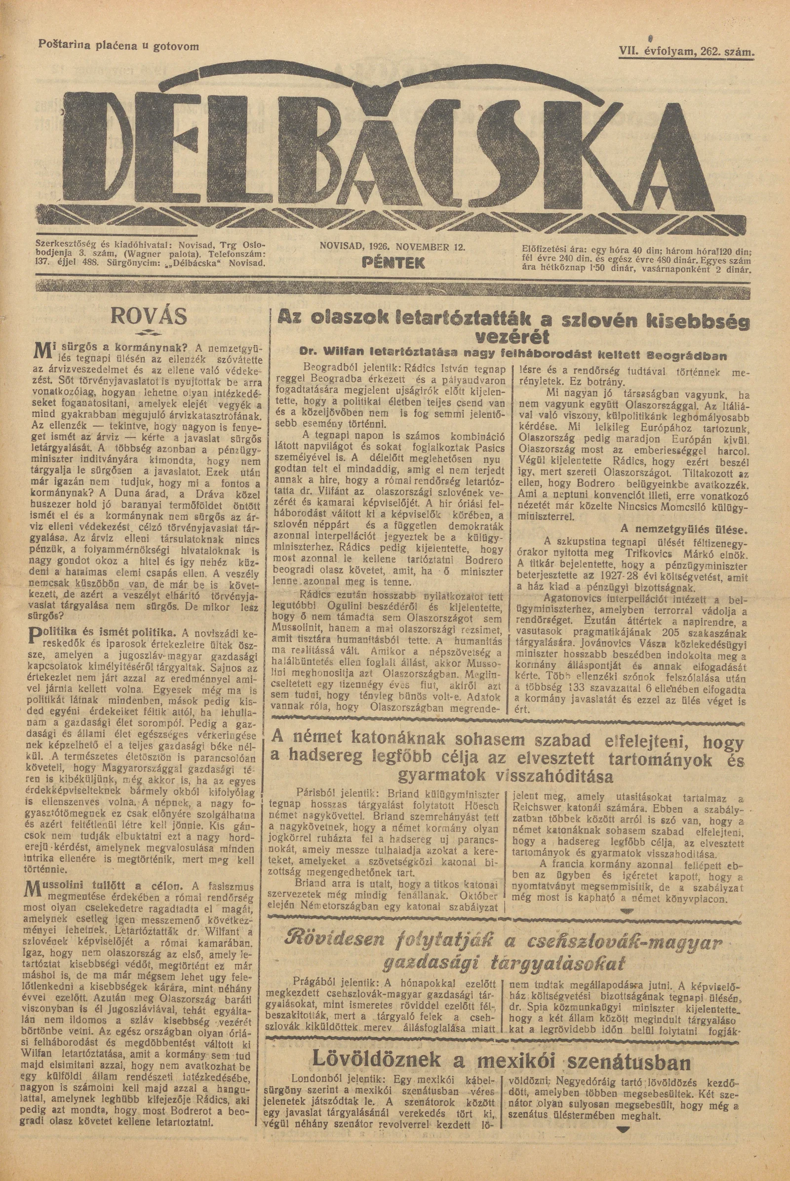 Délbácska, 7. évf. 1926. november 12. 262. sz.