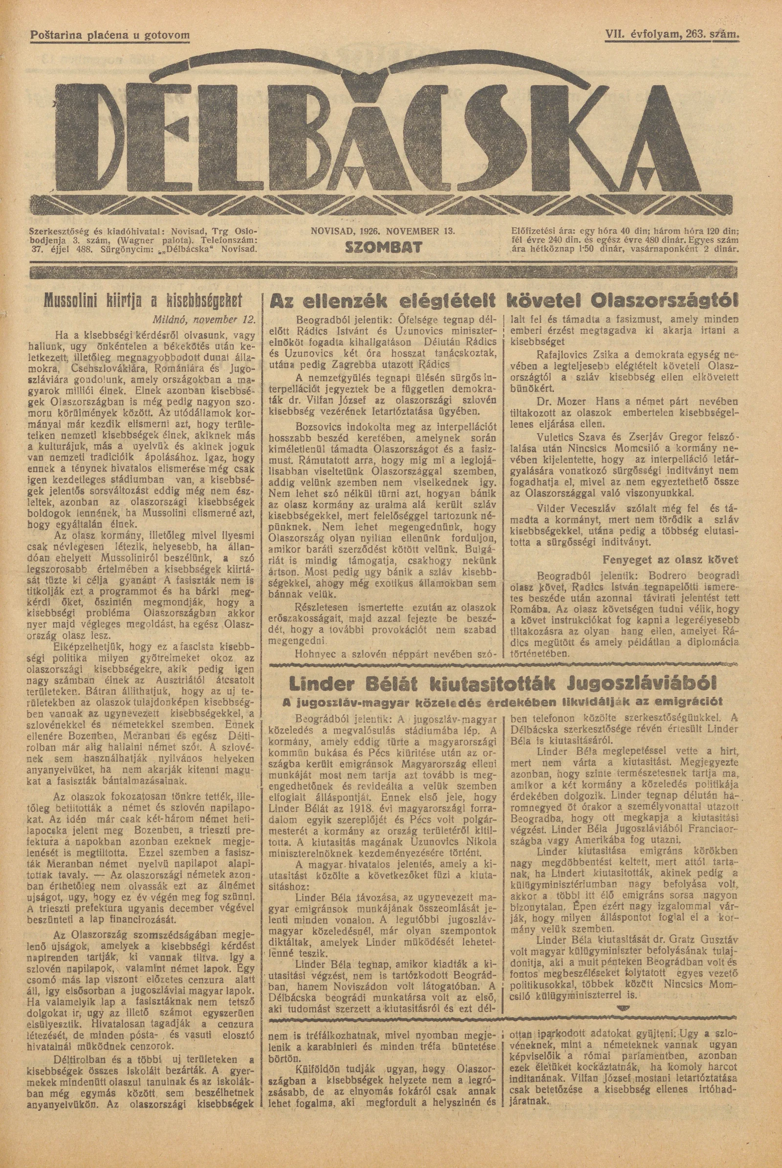 Délbácska, 7. évf. 1926. november 13. 263. sz.
