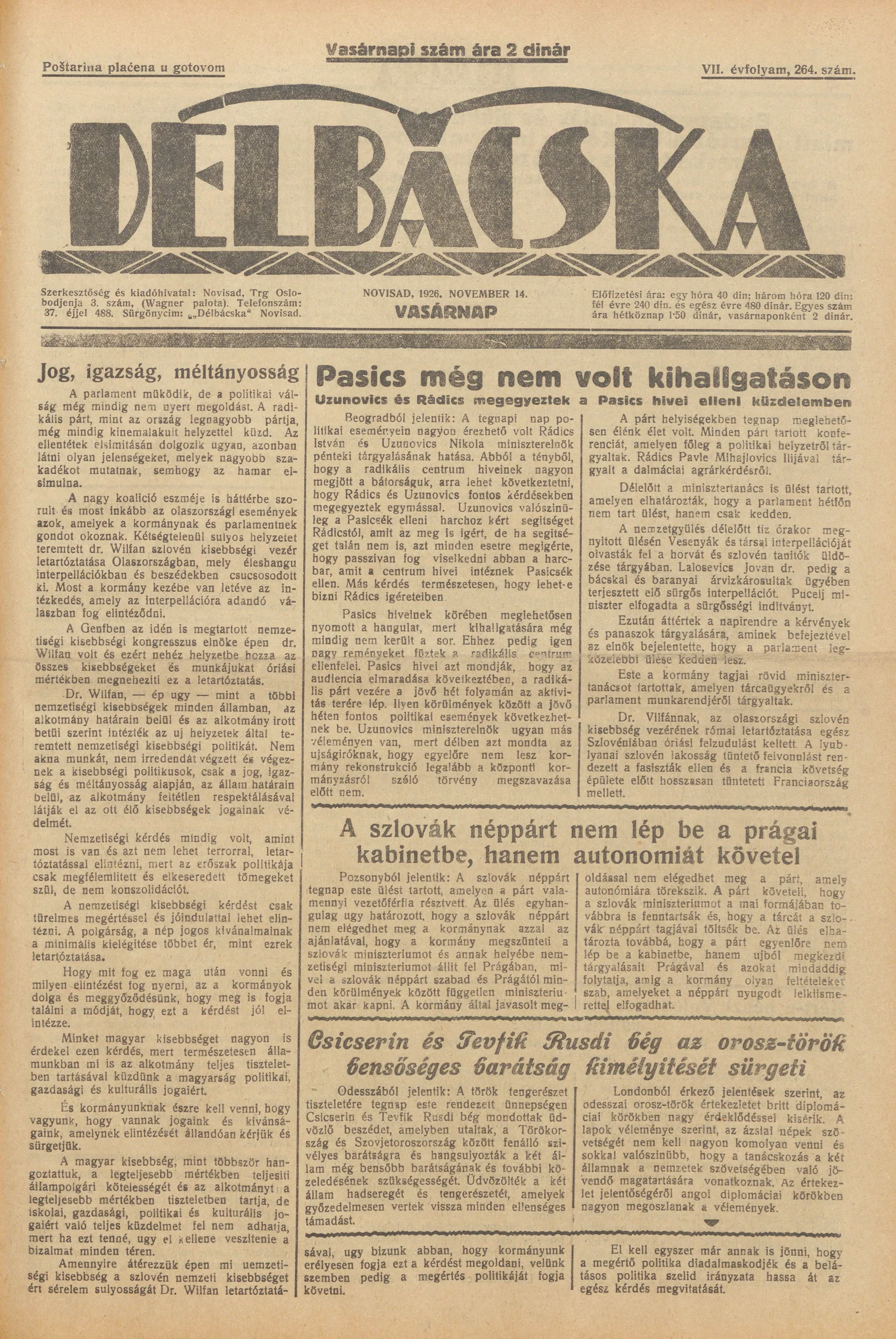 Délbácska, 7. évf. 1926. november 14. 264. sz.