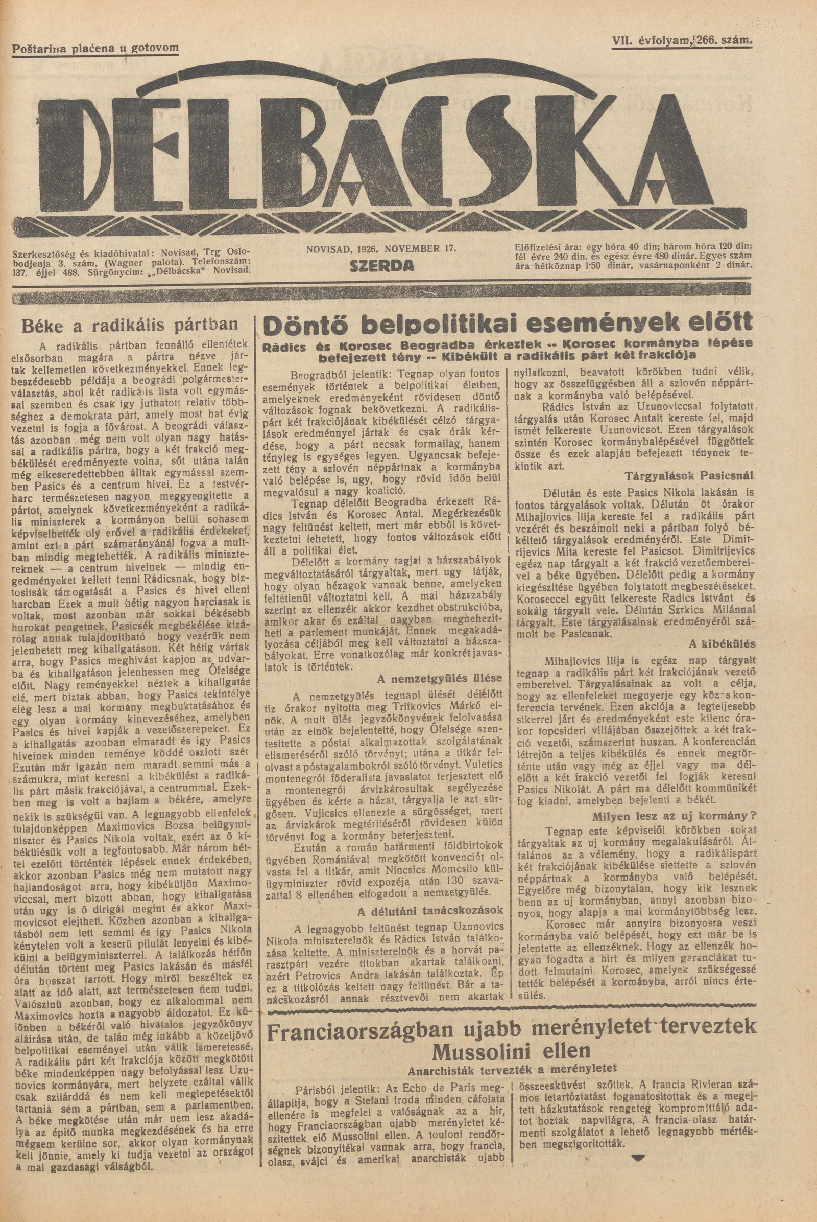 Délbácska, 7. évf. 1926. november 17. 266. sz.