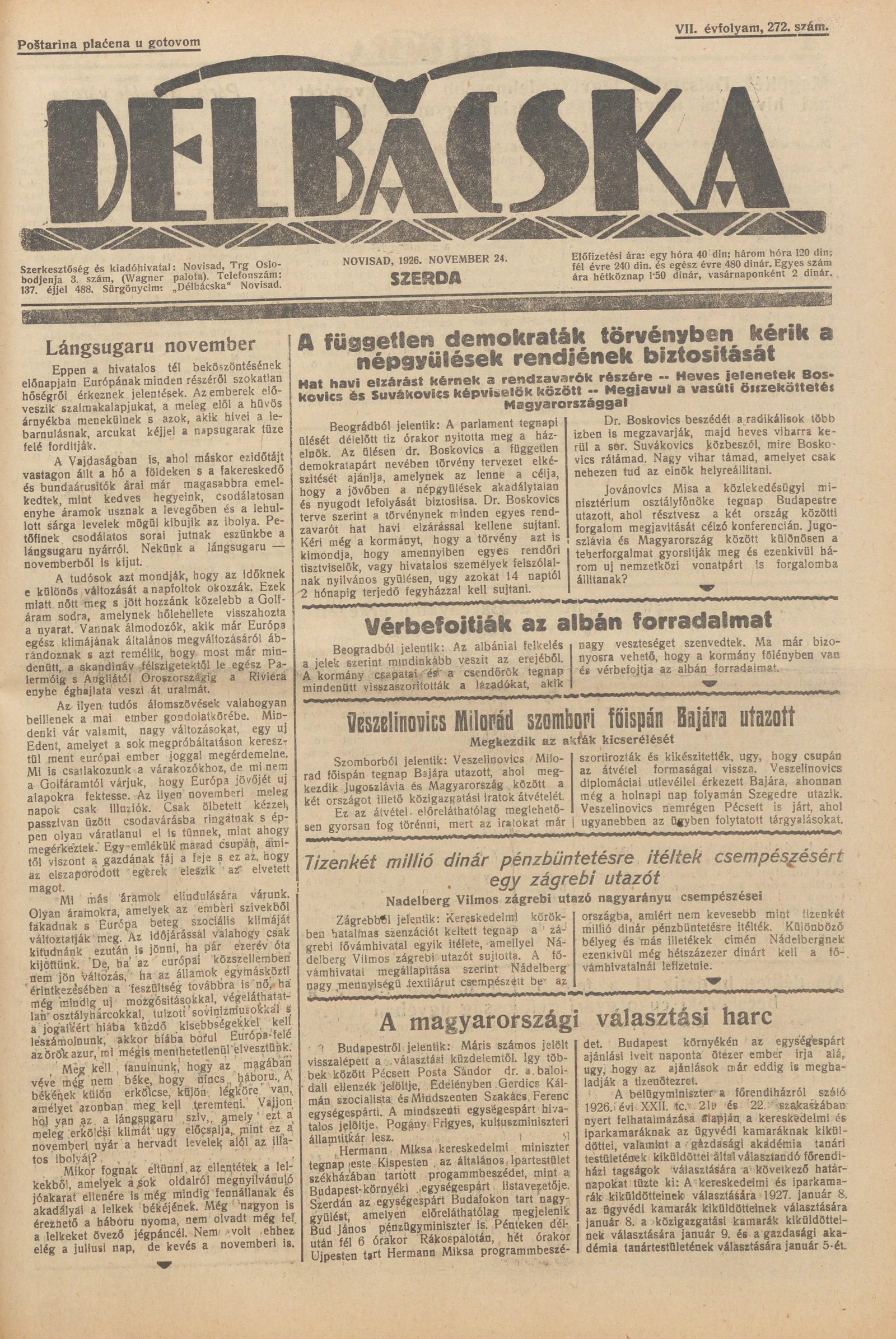 Délbácska, 7. évf. 1926. november 24. 272. sz.