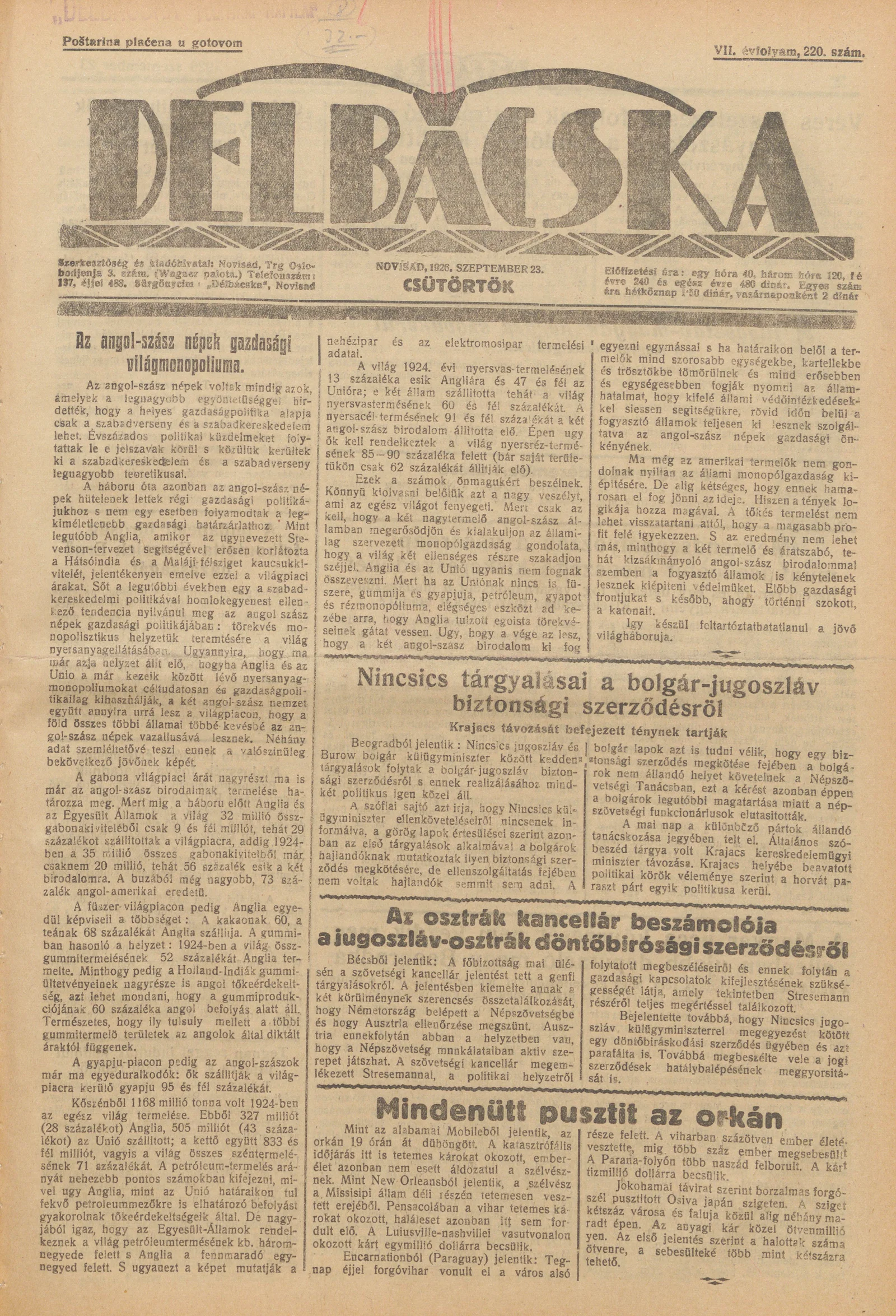Délbácska, 7. évf. 1926. szeptember 23. 220. sz.
