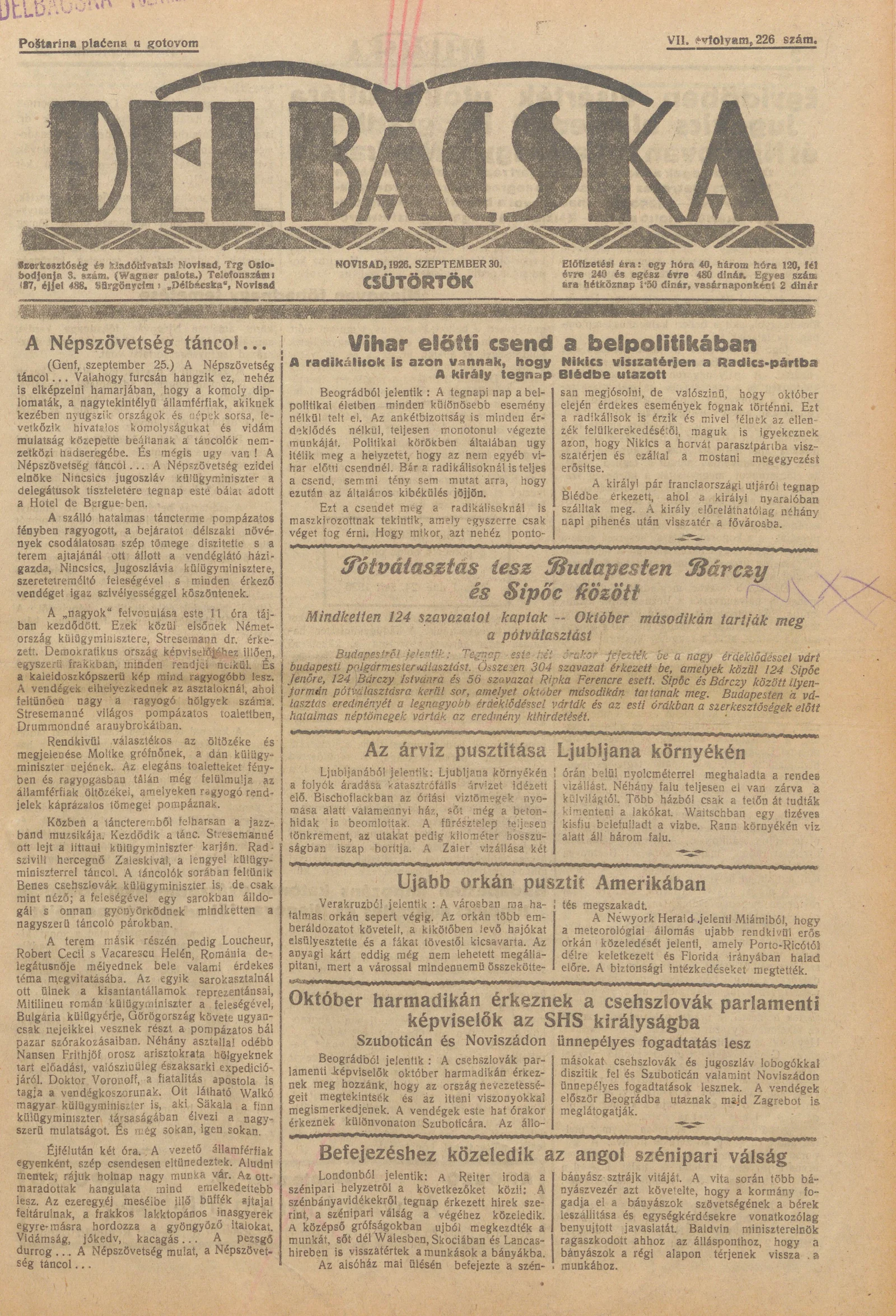 Délbácska, 7. évf. 1926. szeptember 30. 226. sz.