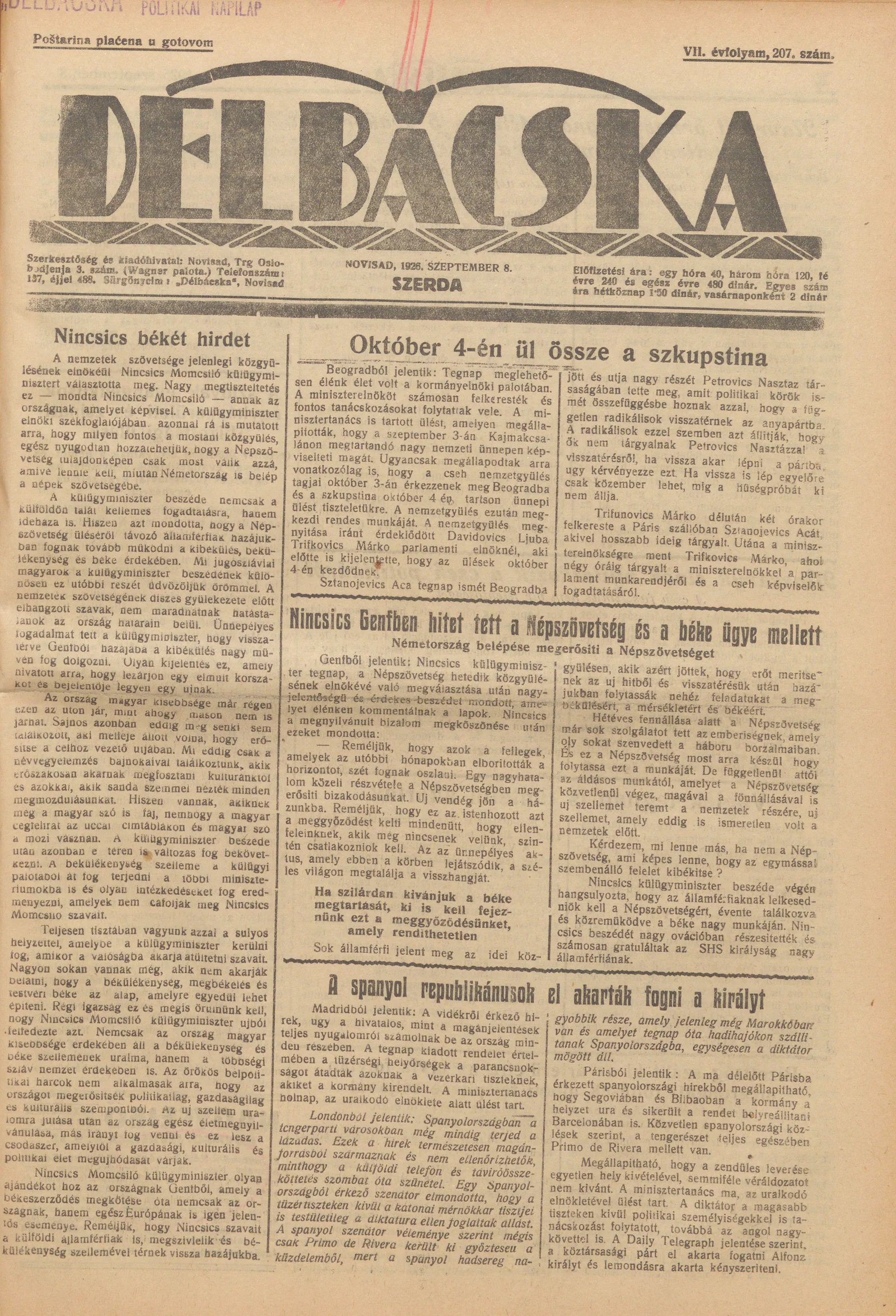 Délbácska, 7. évf. 1926. szeptember 8. 207. sz.