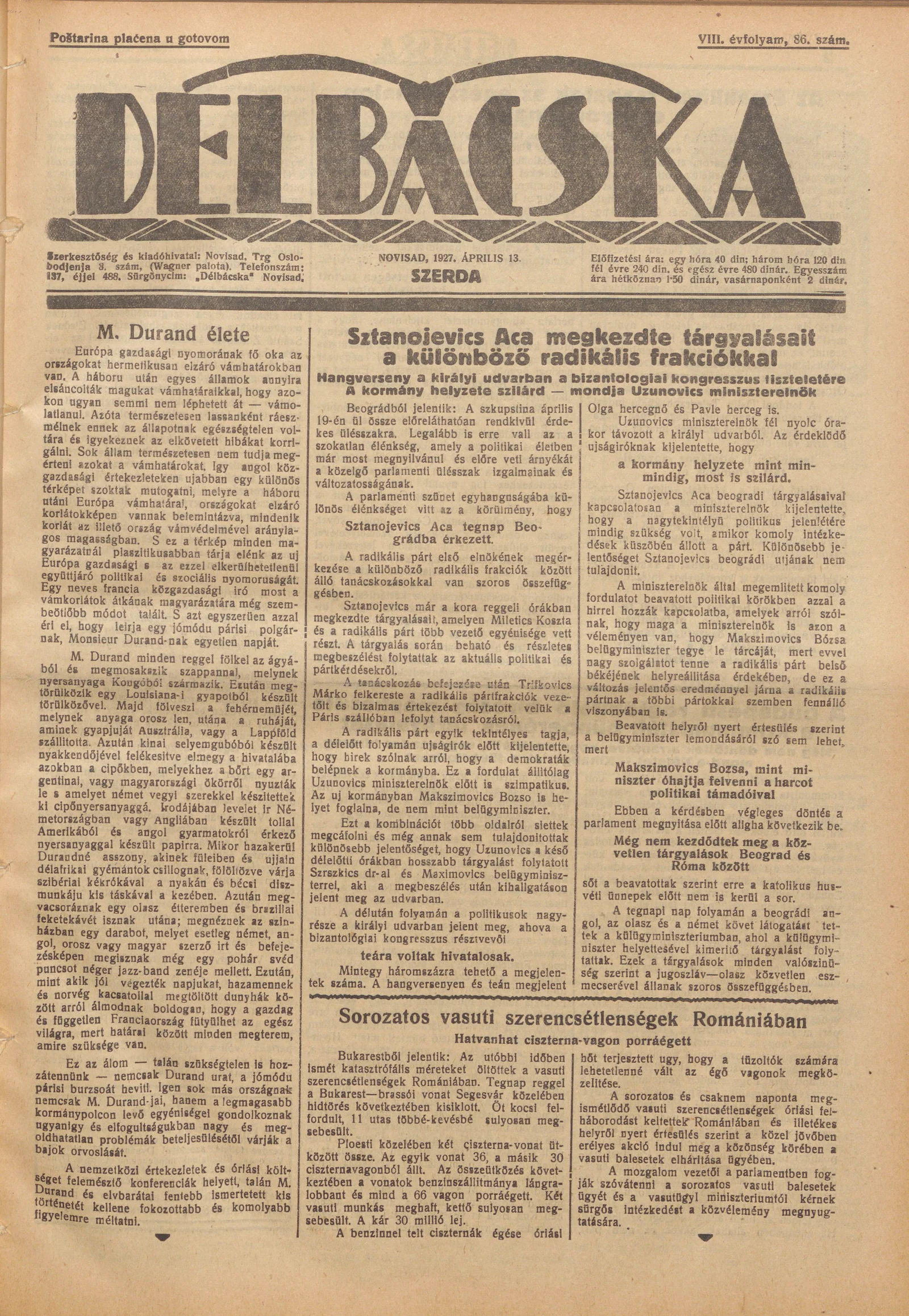 Délbácska, 8. évf. 1927. április 13. 86. sz.
