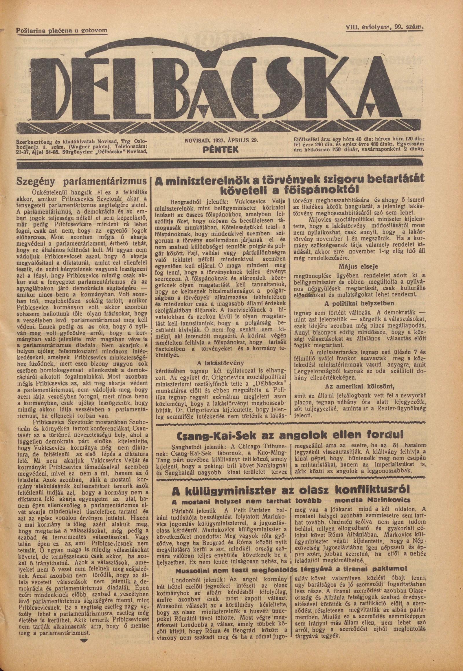 Délbácska, 8. évf. 1927. április 29. 99. sz.