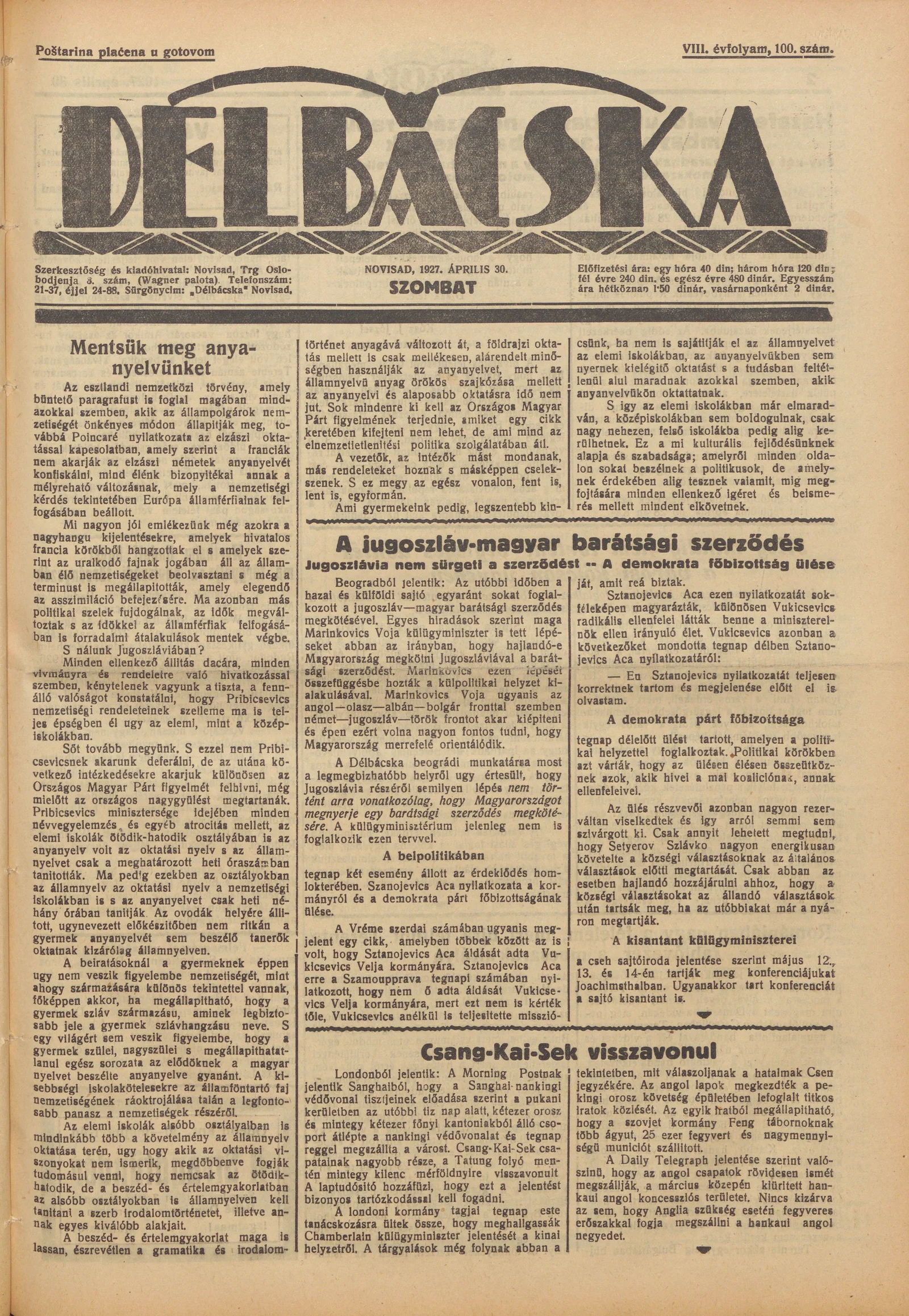 Délbácska, 8. évf. 1927. április 30. 100. sz.