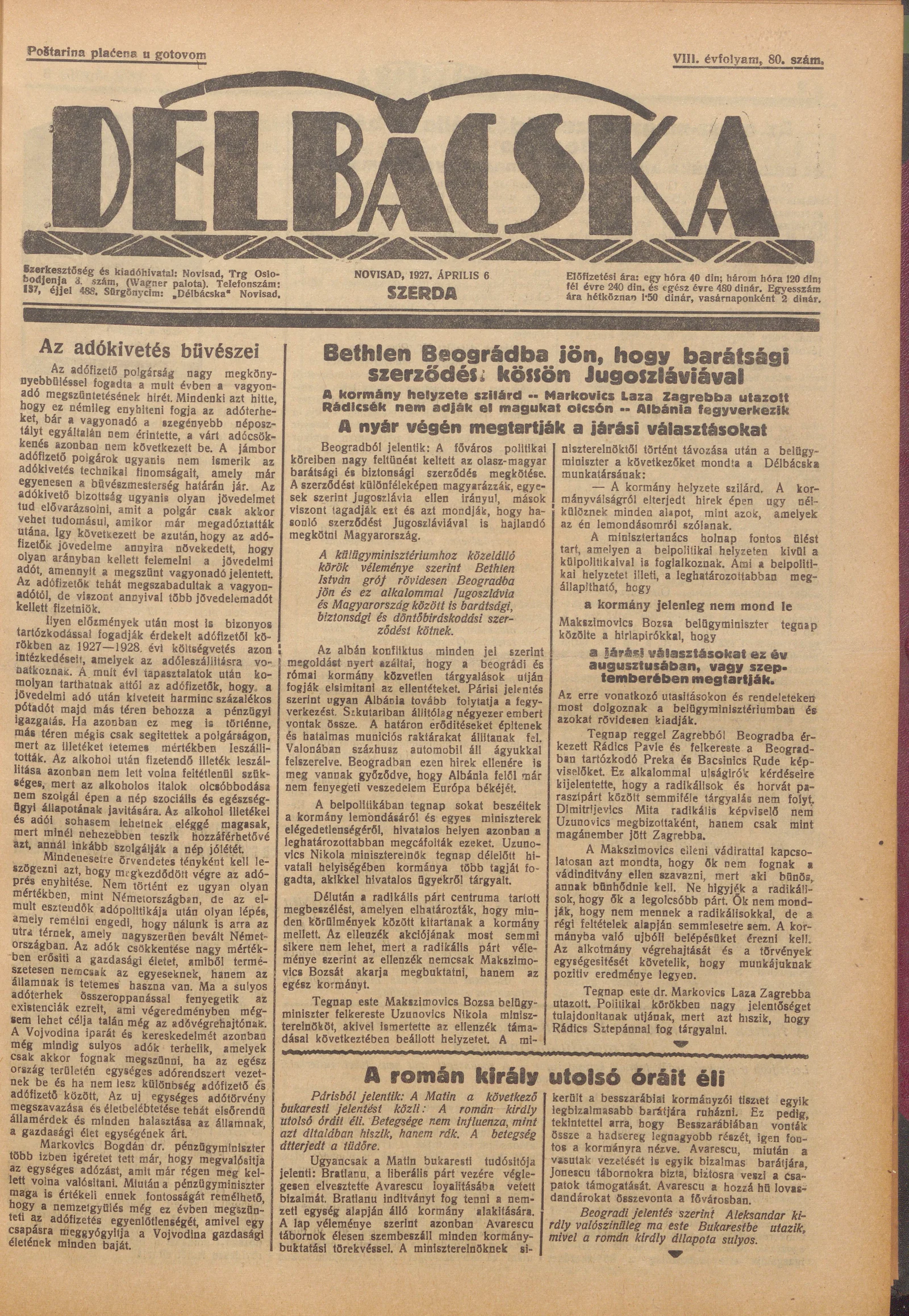 Délbácska, 8. évf. 1927. április 6. 80. sz.