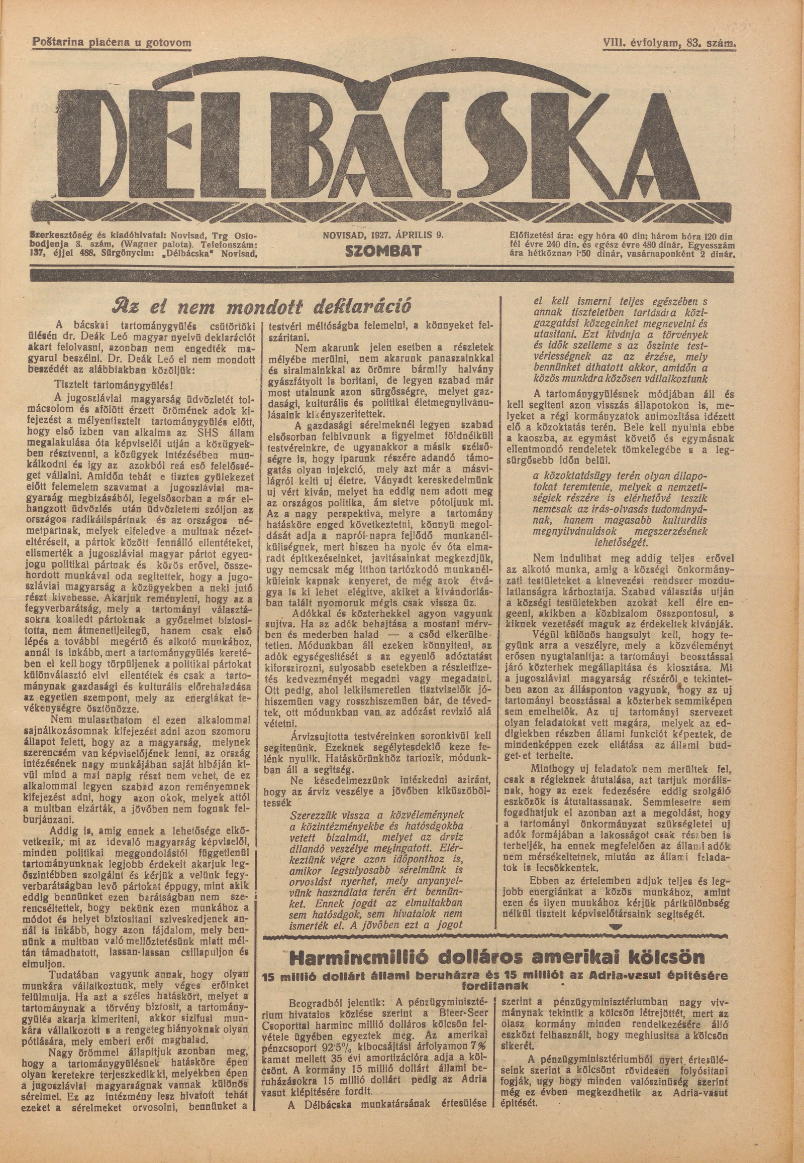 Délbácska, 8. évf. 1927. április 9. 83. sz.